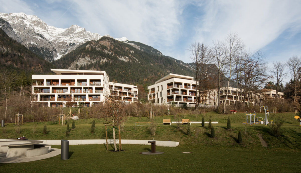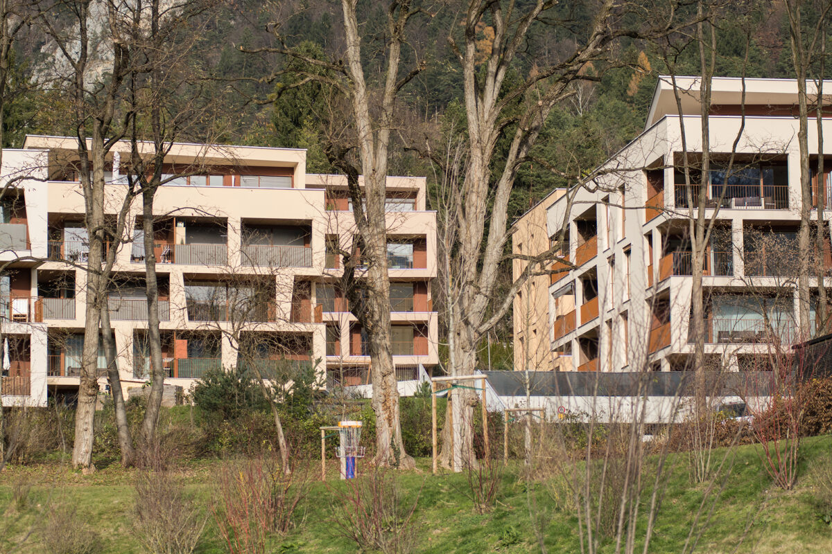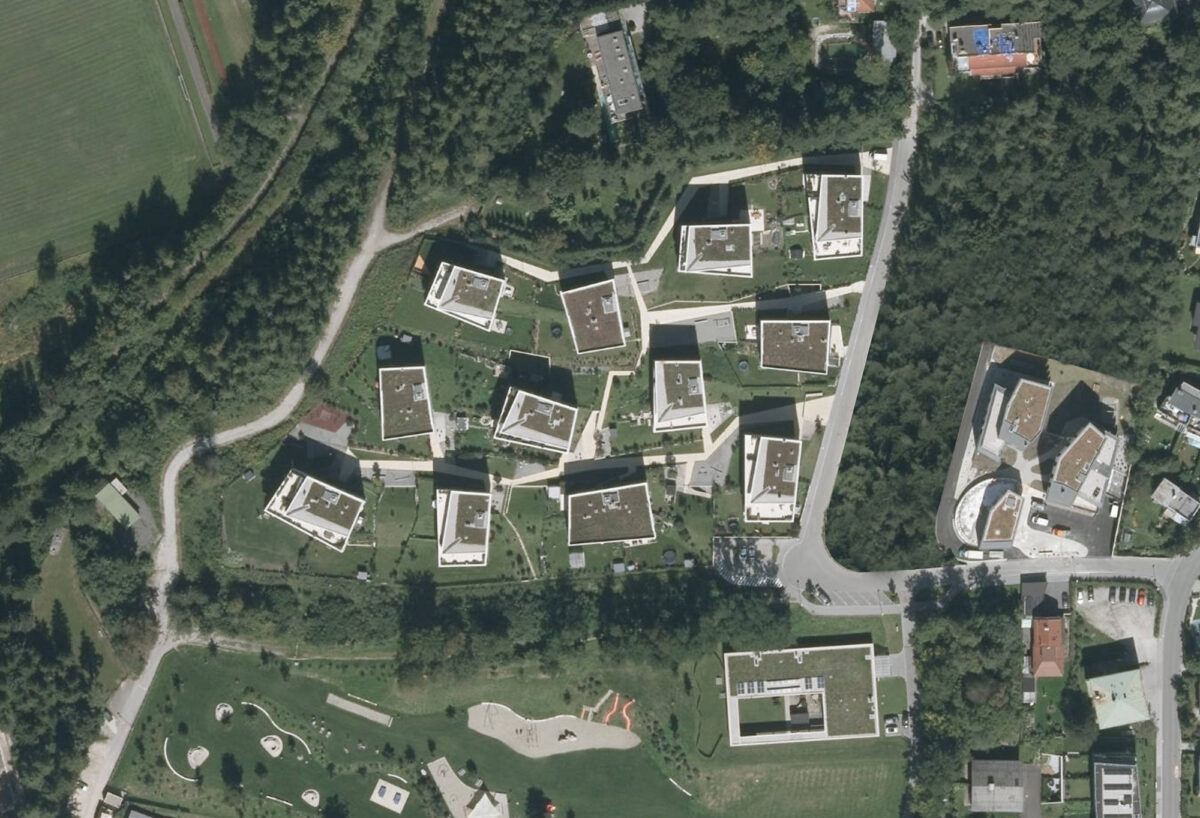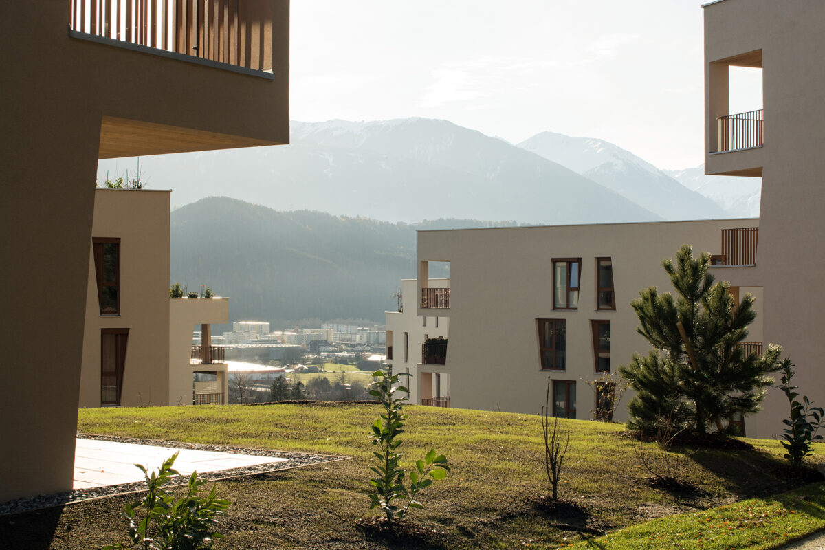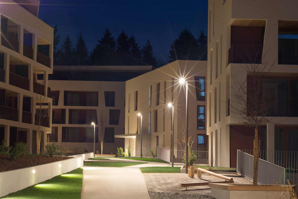 Grün- und Freiflächen sind qualitativ hochwertig gestaltet und bieten eine einladende Wohn- und Erhohlungsatmosphäre an. Baukörper, Wege, Platzflächen, Grünräume stehen in einem stimmigen Dialog zusammen und bilden im Zusammenspiel mit der umgebenden Natur eine neue, sich in die Örtlichkeit eingliedernde Bebauungsstruktur aus. Das bestehende Gelände ermöglicht eine sensible Höhenstaffelung der einzelnen Baukörper zueinander, welche durch die punktuell angeordneten Dachgeschosse verstärkt wird.