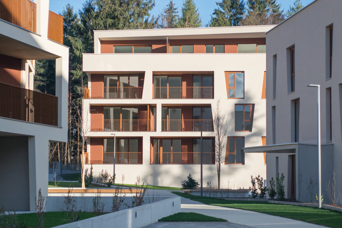 Sämtliche Wohnungen sind mit der Hauptorientierung nach Süden bzw. nach Westen konzipiert. Bei der Situierung der einzelnen Wohnräume, mit ihren vorgelagerten Balkonen, ist sehr auf die freien Ausblicke Bedacht genommen worden. Die vorgestellten Balkonstrukturen im Zusammenspiel mit den teilweise schräg angeschnittenen Fenstern suggerieren die Durchblicke in einem Wald und erinnern an den Charakter der ursprünglichen Waldlandschaft.