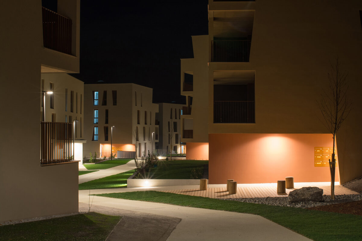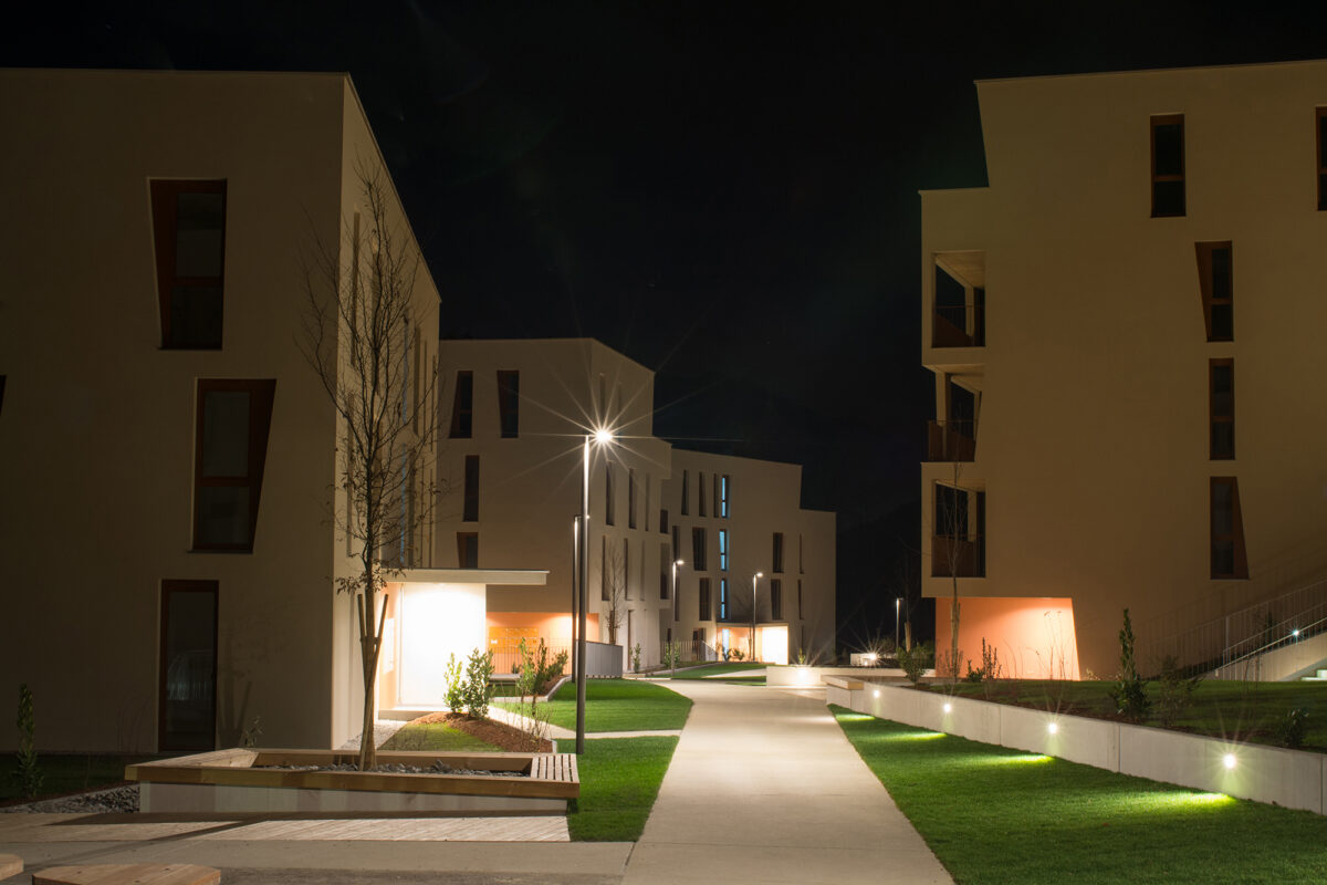 Sensibel bemessene Zwischenräume und ein Wechsel von räumlicher Dichte mit weiten Blicken quer durch die präzise gesetzten Baukörper, verweben den ursprünglichen Ort mit großzügigen Aufenthalts- und Bewegungsräumen. Diese Abfolge von privaten, halböffentlichen und öffentlichen Raumsequenzen ermöglicht den Bewohnern sich zurückzuziehen oder am öffentlichen Leben teilzuhaben.
