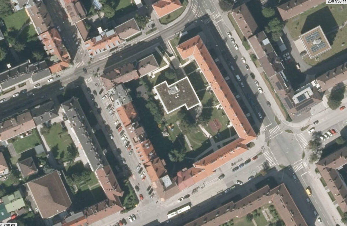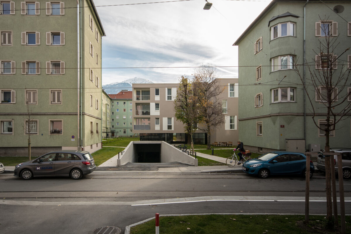 Die bestehende Blockrandbebauung umrahmt einen ruhigen Innenhof mit schönen alten Bäumen im Stadtviertel Pradl. In diesem Grünraum, dessen Weite wahrnehmbar ist, liegt das zu bebauende Grundstück. Die Grundidee des Entwurfes leitet sich aus der Prämisse ab, den neuen Wohnbau so zu positionieren, dass möglichst wenig von diesem naturgewachsenen Raum verbaut wird, um die Identität des Innenhofs zu erhalten. Das Konzept sieht ein punktuelles Solitärgebäude mit einem kompakten Volumen vor, dessen Fußabdruck geringer ist als die rückgebau-te Fläche, die die bestehenden Garagen und Nebenräume beanspruchen. Der Verkehr wird aus der Mitte des Hofes in eine Tiefgarage verlagert, deren Einfahrt unmittelbar an der nördlichen Grundgrenze situiert ist. Höhen-mäßig positioniert sich der Neubau „stöckelgebäudeartig“, untergeordnet zu der dominanten Blockrandbebauung.