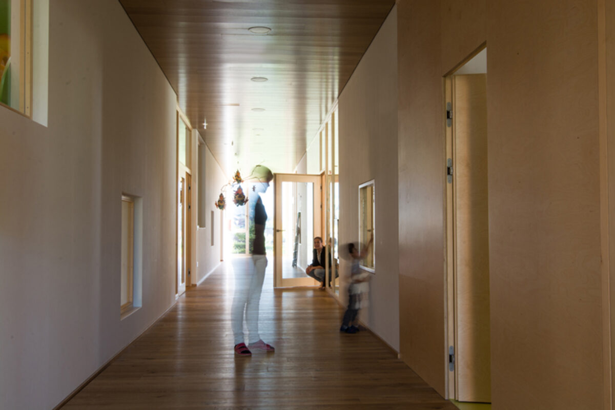 Die einzelnen Gruppenräume sind jeweils mit einem dazwischenliegenden Teilungsraum als Bindeglied und Ausweichraum konzipiert. Bewegungsräume, Spielflur, Gruppen und – Teilungsräume können durch flexible Öffnungen beliebig miteinander vernetzt werden.