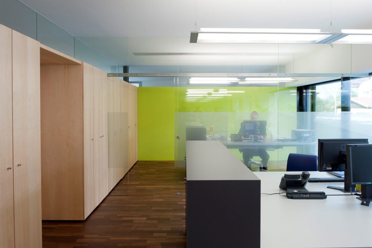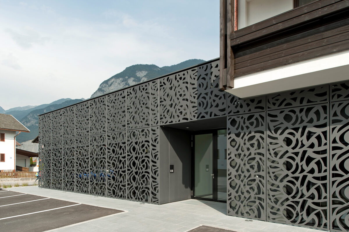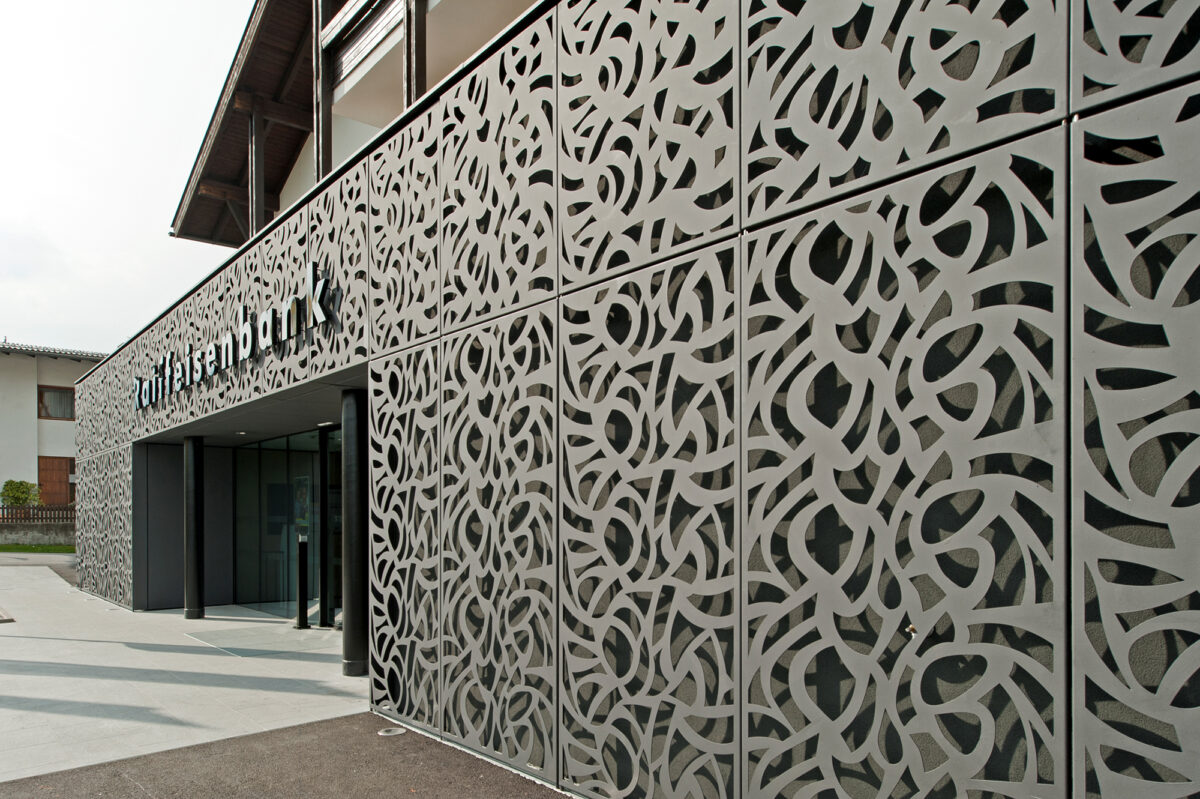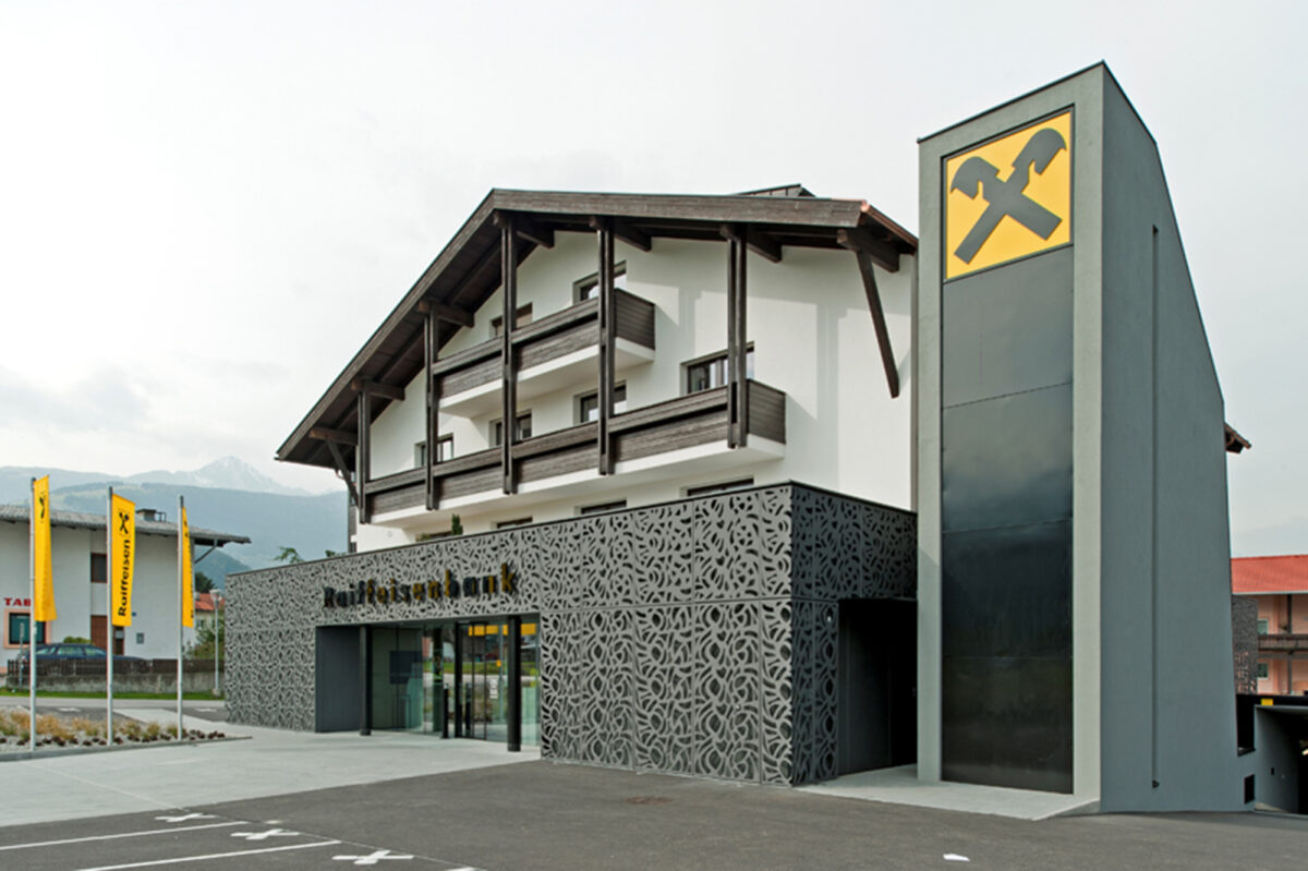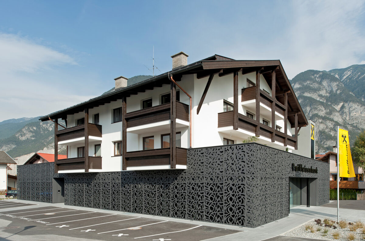 Der bestehende viergeschossige Baukörper der Raiffeisenbank Kematen stammt aus den 1960er Jahren und liegt – unmittelbar an der Bundesstraße – am östlichen Rand des Ortes. Als Bankbereiche wurden bisher – neben dem Erdgeschoss – auch Teile der beiden Obergeschosse genutzt. Ferner sind im Gebäude eine Ordination sowie drei Wohnungen untergebracht. Aufgabe war es, nach gewonnenem Wettbewerb die Räumlichkeiten der Bank im Erdgeschoss nach Westen hin zu erweitern und zugleich die von ihr genutzten oberen Bereiche über eine neue Erschließung miteinander zu verbinden. Somit konnte der Zugang zu den Bankzonen in den Obergeschossen, sowie zu den Wohnungen über die bisher gemeinsame Treppe entflochten werden. Im Zuge der Erweiterung des Erdgeschosses wurde diese Ebene zu einem Sockelgeschoss umfunktioniert, welches sich optisch nach außen auch als solches deutlich zu erkennen gibt. Rundum eingefasst wird es von anthrazit-farbigen Stahlpaneelen mit einer ausgeschnittenen Ornamentstruktur. Diese Ornamentik dient einerseits als Sicht und Sonnenschutz zu den Innenräumen hin, andererseits widerspiegelt sie die Lebendigkeit der Bank. Aus diesem neu akzentuierten Sockel wachsen sodann die Obergeschosse des Altbaus heraus. Durch dieses völlig neue Erscheinungsbild wird die Bank für alle zu einem Blickfang und zu einer architektonischen Bereicherung im Ortsraum.