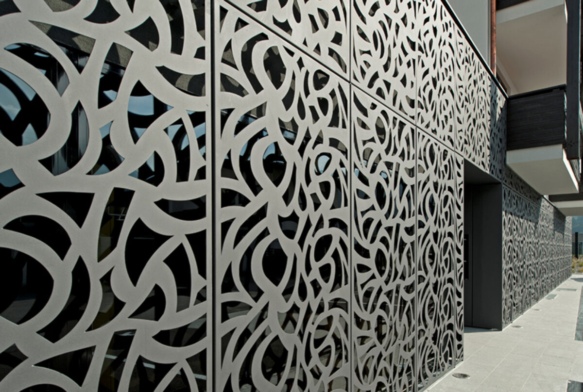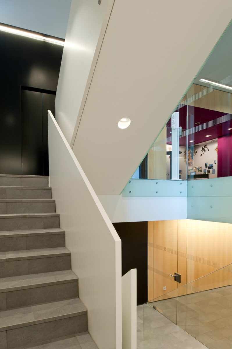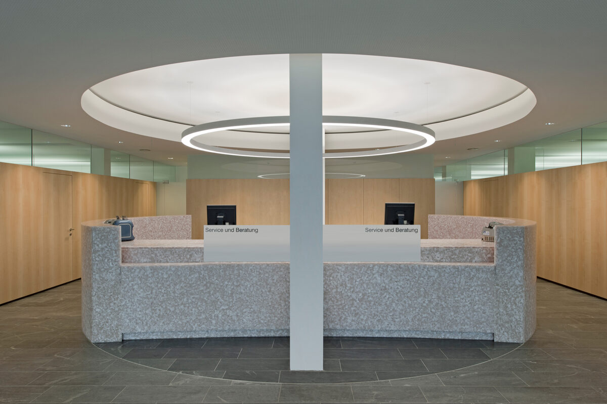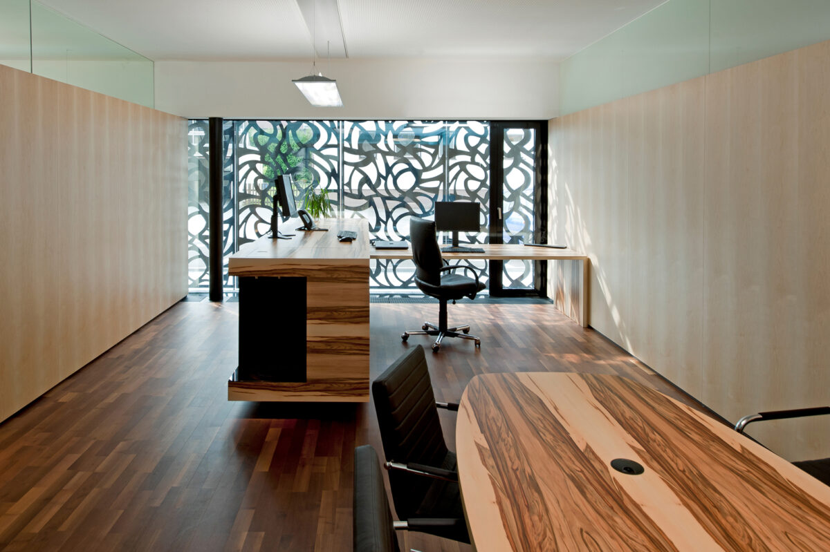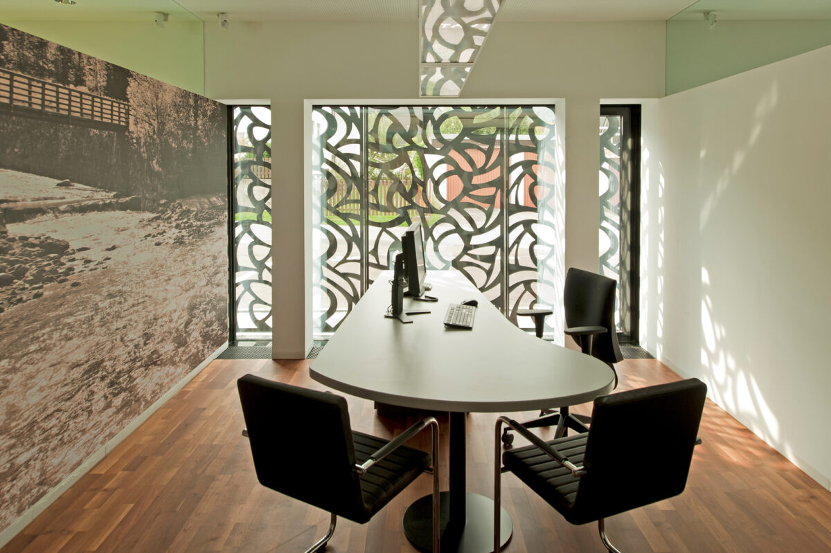Der bestehende viergeschossige Baukörper der Raiffeisenbank Kematen stammt aus den 1960er Jahren und liegt – unmittelbar an der Bundesstraße – am östlichen Rand des Ortes. Als Bankbereiche wurden bisher – neben dem Erdgeschoss – auch Teile der beiden Obergeschosse genutzt. Ferner sind im Gebäude eine Ordination sowie drei Wohnungen untergebracht. Aufgabe war es, nach gewonnenem Wettbewerb die Räumlichkeiten der Bank im Erdgeschoss nach Westen hin zu erweitern und zugleich die von ihr genutzten oberen Bereiche über eine neue Erschließung miteinander zu verbinden. Somit konnte der Zugang zu den Bankzonen in den Obergeschossen, sowie zu den Wohnungen über die bisher gemeinsame Treppe entflochten werden. Im Zuge der Erweiterung des Erdgeschosses wurde diese Ebene zu einem Sockelgeschoss umfunktioniert, welches sich optisch nach außen auch als solches deutlich zu erkennen gibt. Rundum eingefasst wird es von anthrazit-farbigen Stahlpaneelen mit einer ausgeschnittenen Ornamentstruktur. Diese Ornamentik dient einerseits als Sicht und Sonnenschutz zu den Innenräumen hin, andererseits widerspiegelt sie die Lebendigkeit der Bank. Aus diesem neu akzentuierten Sockel wachsen sodann die Obergeschosse des Altbaus heraus. Durch dieses völlig neue Erscheinungsbild wird die Bank für alle zu einem Blickfang und zu einer architektonischen Bereicherung im Ortsraum.