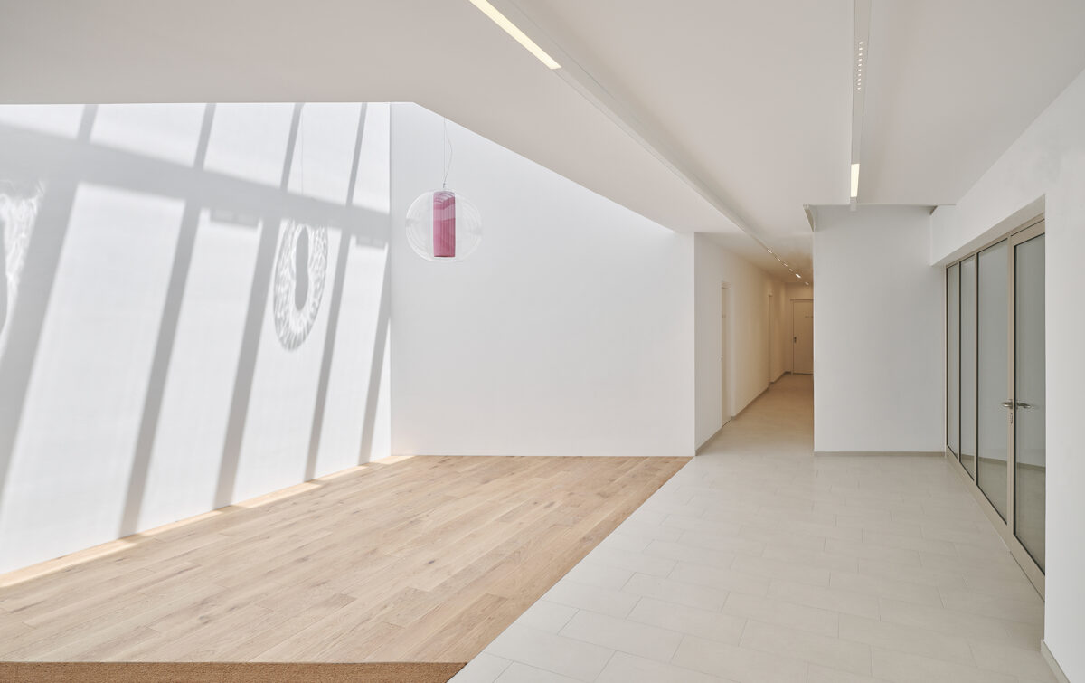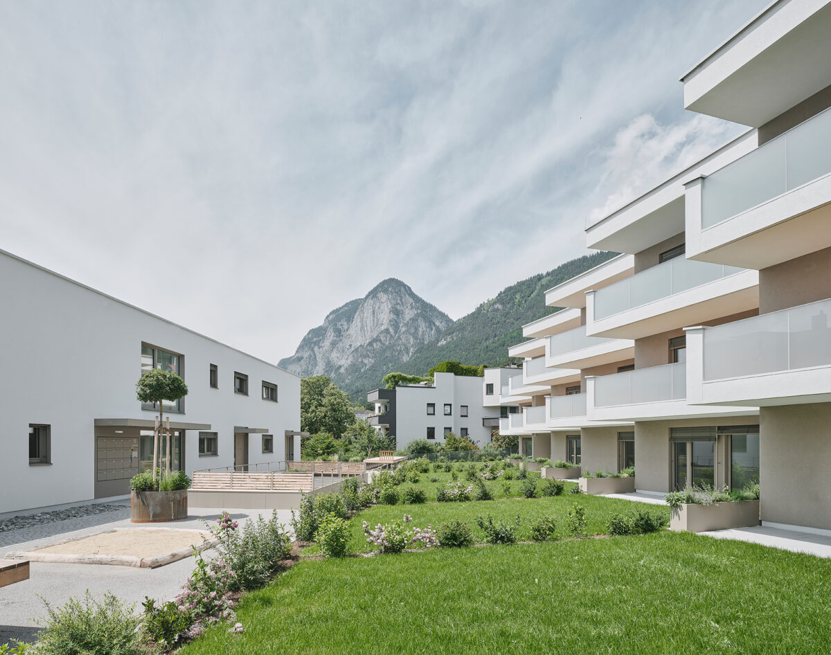 Die Einfahrt in die zweigeschossige Tiefgarage von Westen her und wird parallel zum Saurweinweg geführt. Die Verkehrsflächen wurden auf das Minimum reduziert, um möglichst viel Grünraum mit verschiedenartigen Bepflanzungen in Form von Bäumen, Sträuchern und Büschen zu generieren.