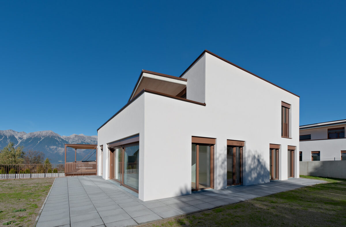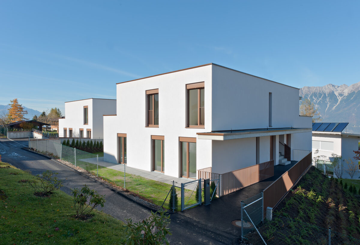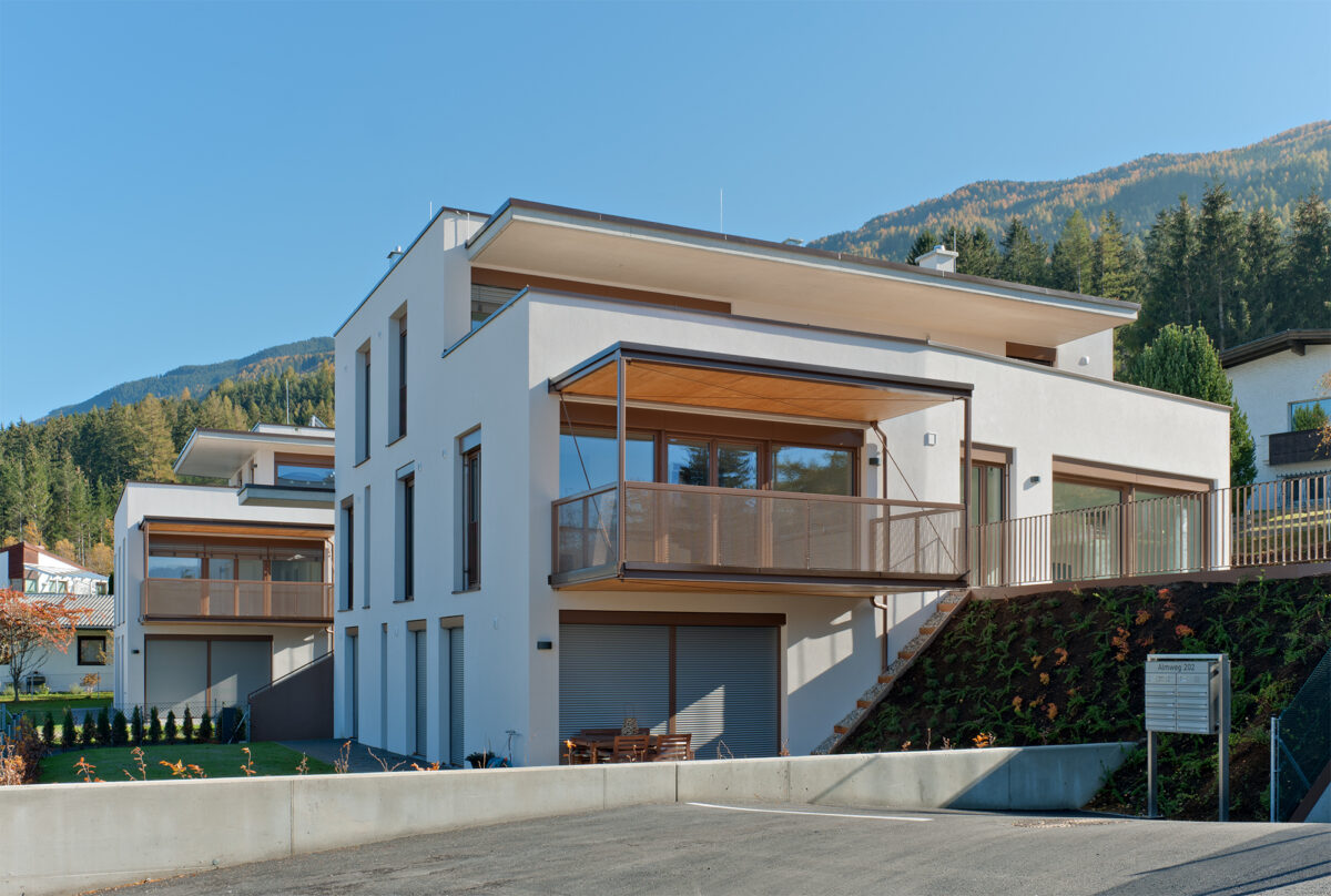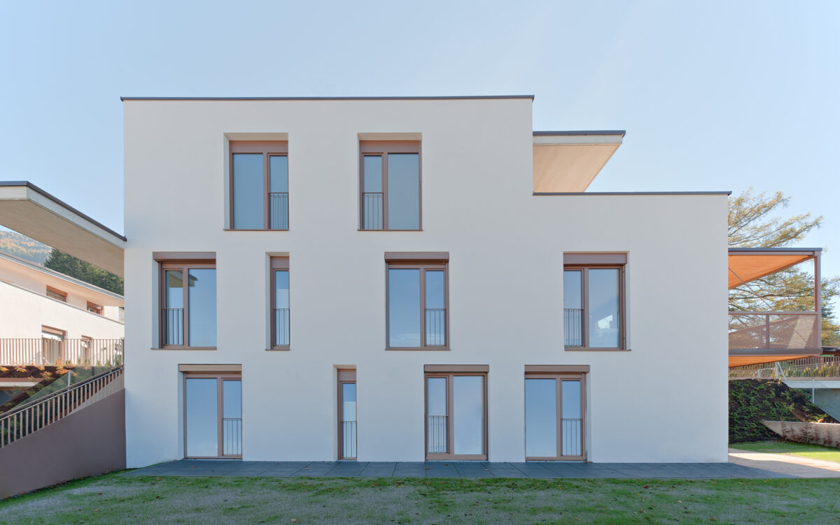 Zwei Baukörper, welche sich in ihrer Grundrissform an der schönen Aussicht und Besonnung orientieren, gliedern sich harmonisch in die umgebende Bebauung und in das natürliche Gelände ein. Sie sind zweigeschossig, mit jeweils einem zurückgesetztem Penthouse ausgebildet. Durch diesen Rücksprung entstehen zwei großzügige L – förmige Terrassen für die oberen Wohneinheiten.