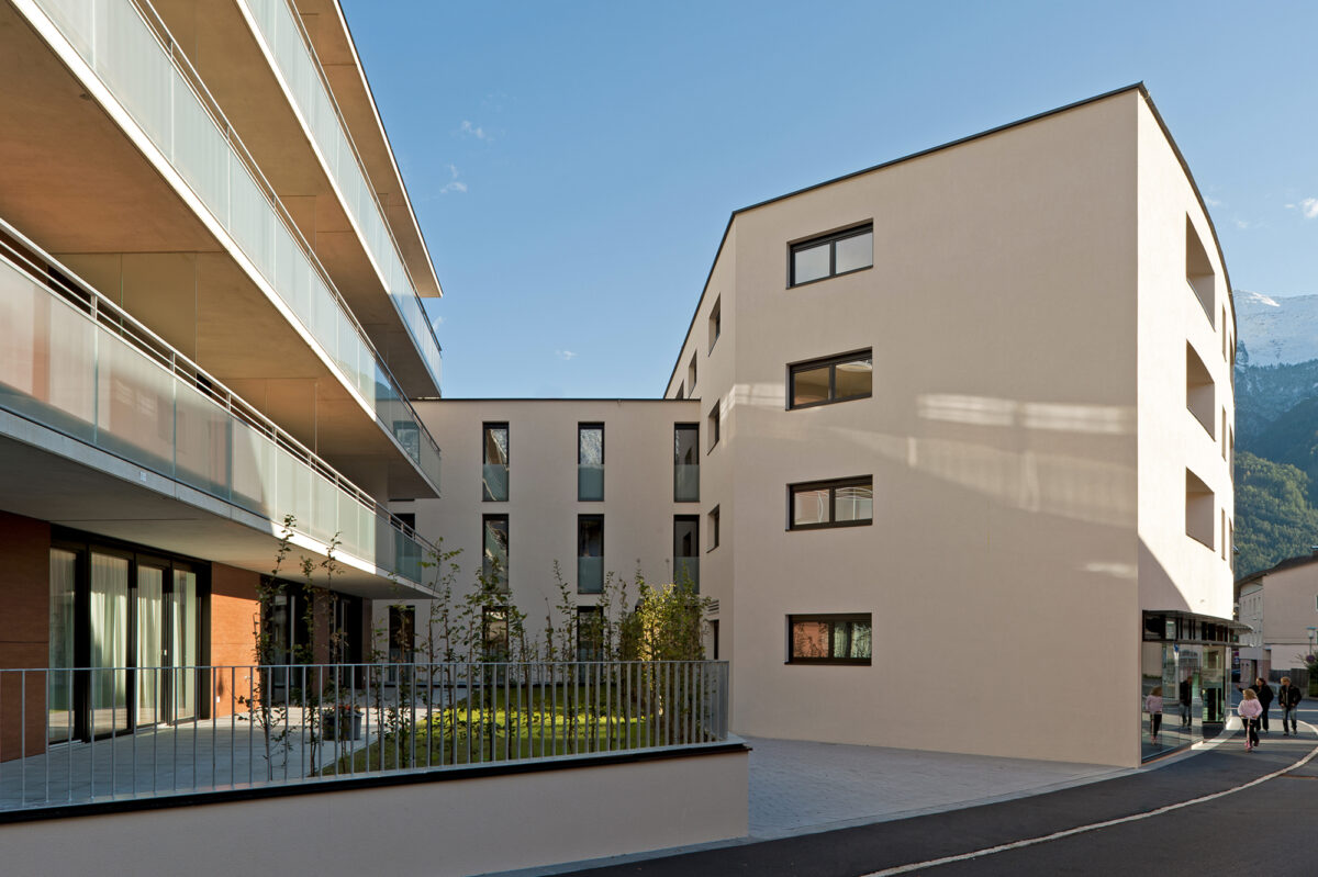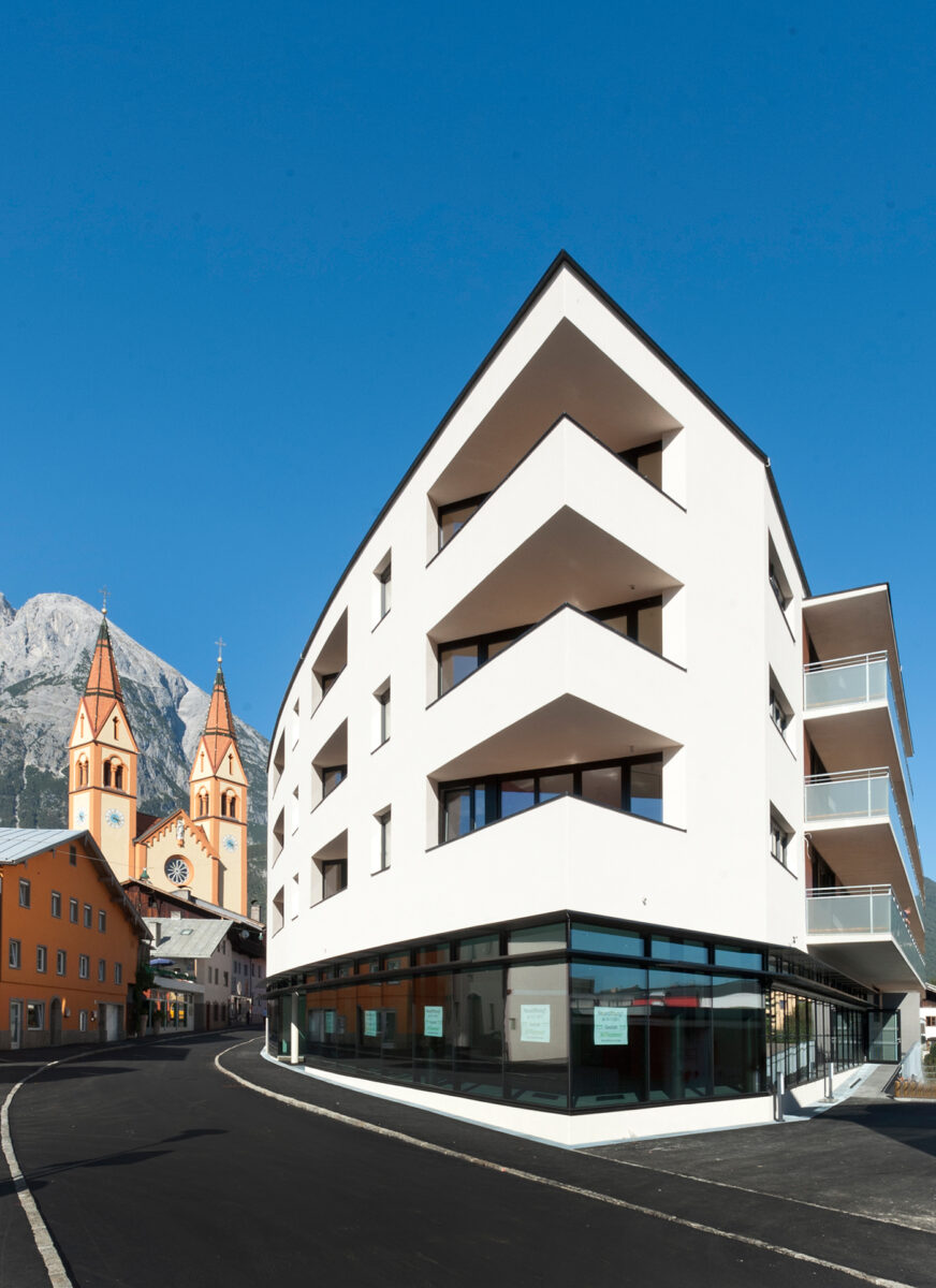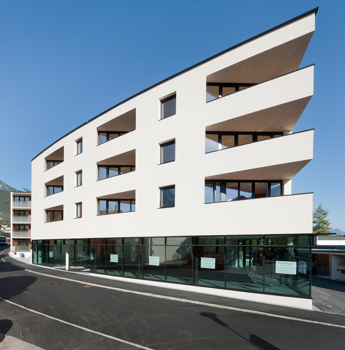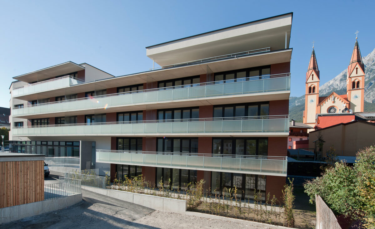 Der Neubau dient als soziales Zentrum der Marktgemeinde Telfs und präsentiert sich als fünfgeschossiger, einfühlsam strukturierter Baukörper, der in seinem Grundriss den Eigenheiten des Grundstücks angepasst ist. Dabei folgt er im Westen der Rundung der Kirchstraße und stellt sich mit seiner Ost- und Südfassade den angrenzenden, unregelmäßigen Baustrukturen klar entgegen. Ein Einschnitt an der Kirchstraße öffnet das Volumen nach Westen und ermöglicht die Belichtung und Besonnung der im Osten angesiedelten Wohnungen.
