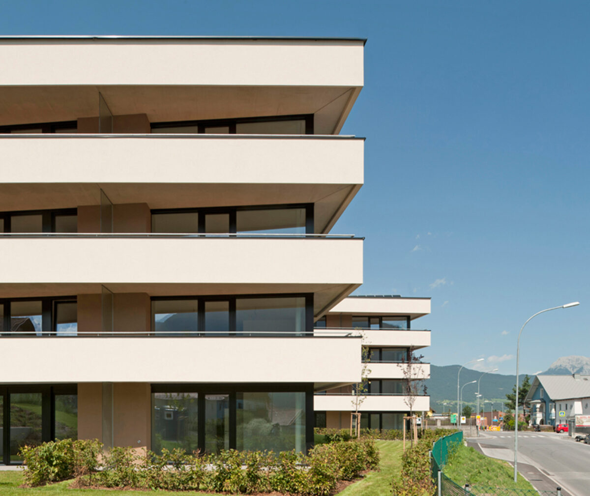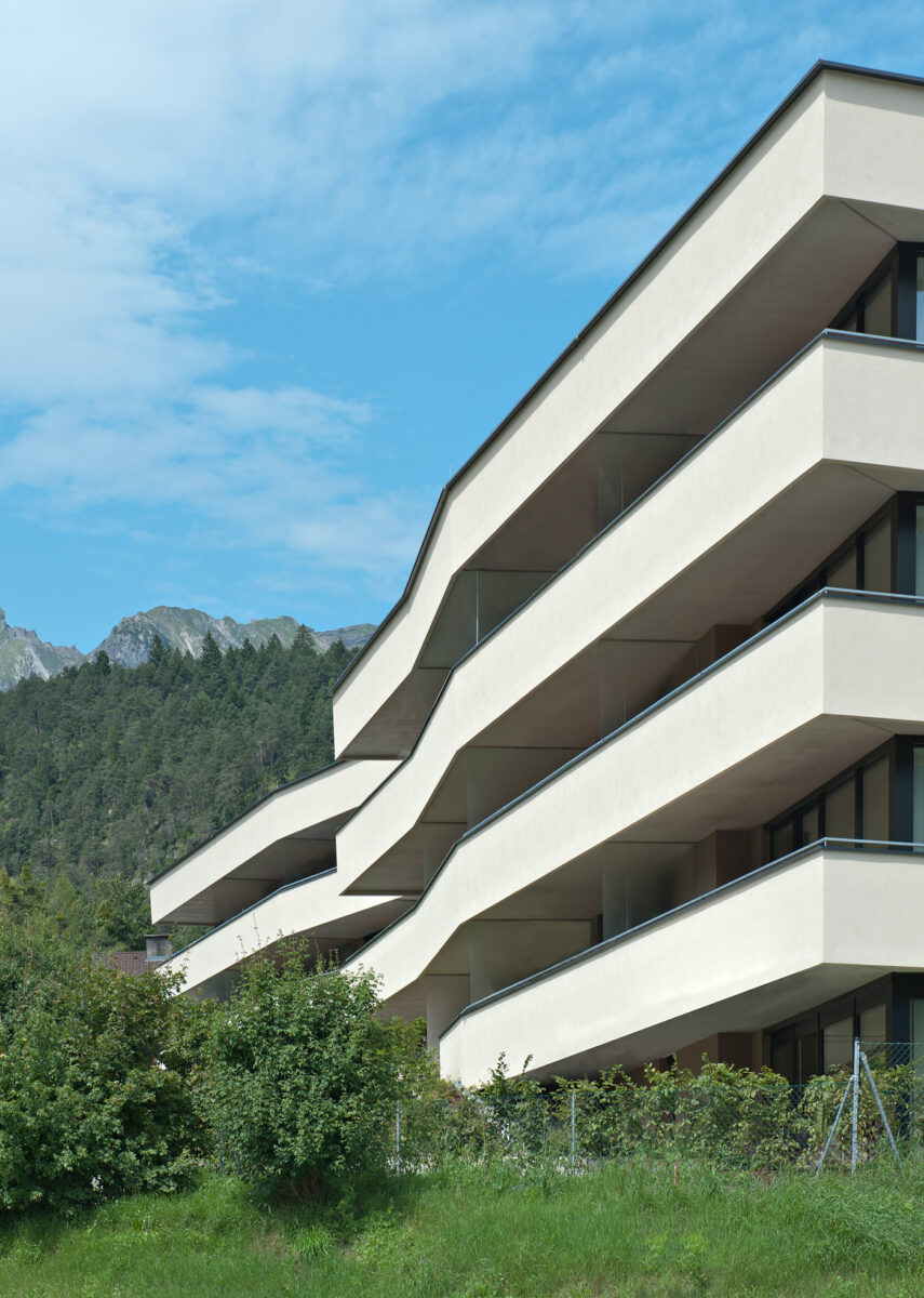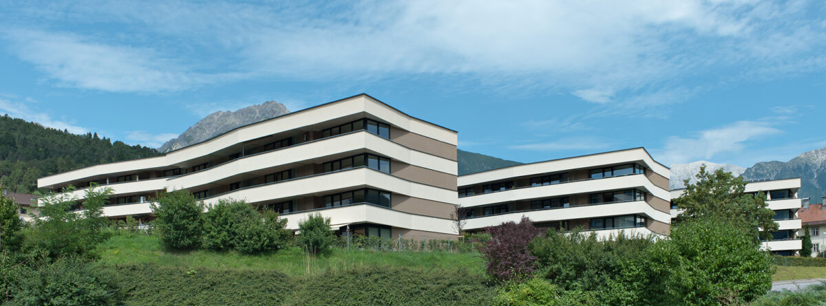 Die einzelnen Baukörper sind parallel zur topografischen Höhenstruktur, jeweils um eine Geschosshöhe gestaffelt angeordnet und somit in ihrer Hauptorientierung nach Süden ausgerichtet. Die dadurch möglichen großzügigen Abstände zwischen den einzelnen Baukörpern geben, verstärkt auch durch die Höhenstaffelung, den bevorzugten und schönen Ausblick frei.