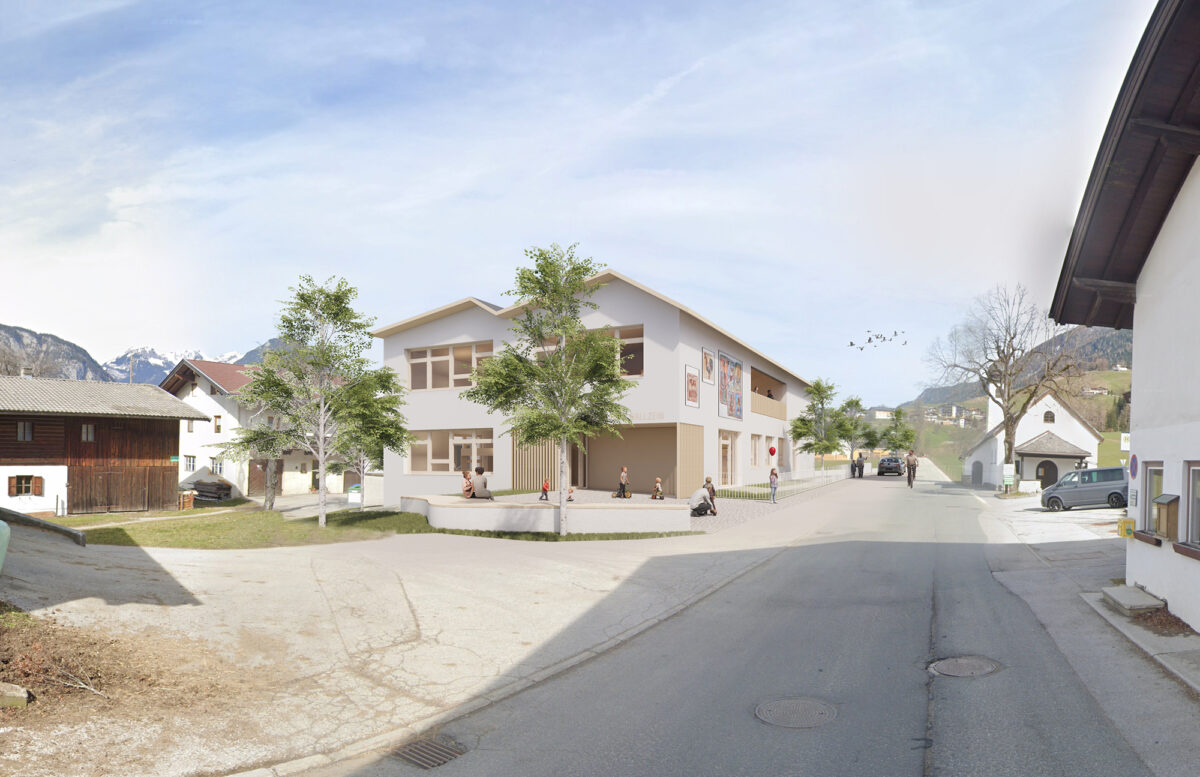 Das vorliegende Konzept leitet sich aus dem Bestreben heraus, ein zeitgemäßes Haus für Bildung in die gewachsene Dorfstruktur zu integrieren, welches die Logik des Orts fortsetzt. Darüber hinaus die Bereiche im Freien mit ihren unterschiedlichen Aufenthaltsqualitäten und Orientierungen miteinander zu verbinden, um ein räumliches Gefüge entstehen zu lassen, welches einen qualitätsvollen Raum für Kommunikation und Vernetzen anbietet. Der neue Kindercampus signalisiert architektonisch in seiner Präsenz die Bedeutung für das Dorf und schafft gleichzeitig den räumlichen Abschluss des Ortes nach Osten.