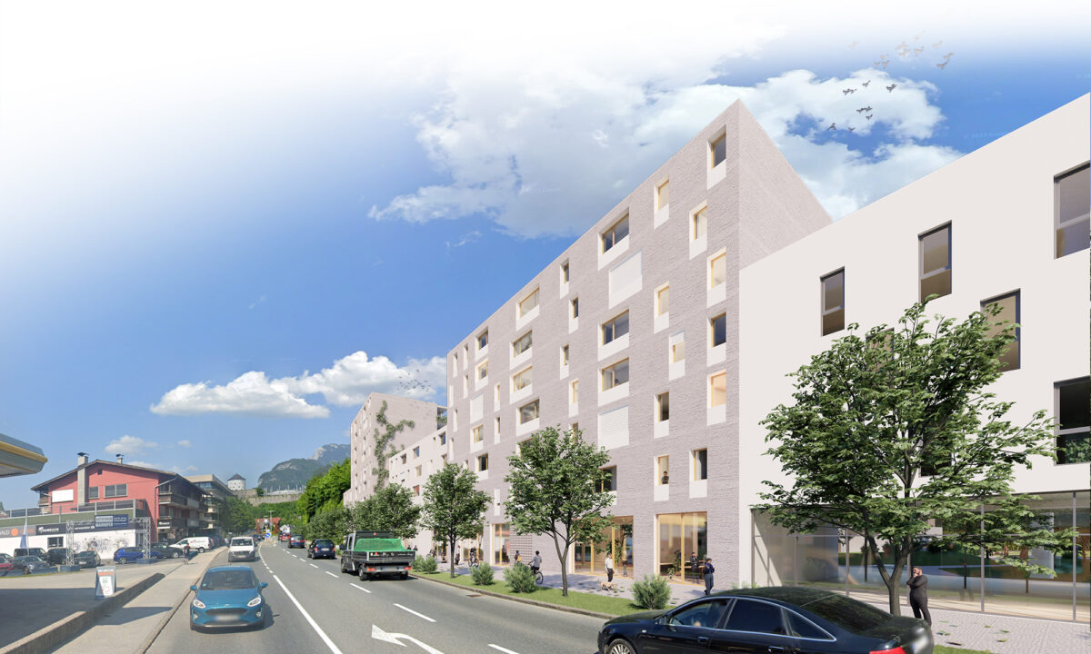 Die langgezogene, gestaffelte Baukörperzeile zur stark befahrenen Salurnerstraße hin, bildet die Abschirmung von Lärm und Immissionen für das neue Quartier. Aufenthaltsräumen, welche in Richtung B171 orientiert sind, gruppieren sich an eine geschlossene Loggia, die wesentlich zur Schall Reduktion beiträgt, und einen zusätzlich nutzbaren Freiraum entstehen lässt. Richtung Innenhof sind großzügige Balkone angedacht die zueinander in verschieden großen Abständen ein rhythmisches Fassadenbild – welches durch die Fassadenbegrünung verstärkt wird – ergeben.