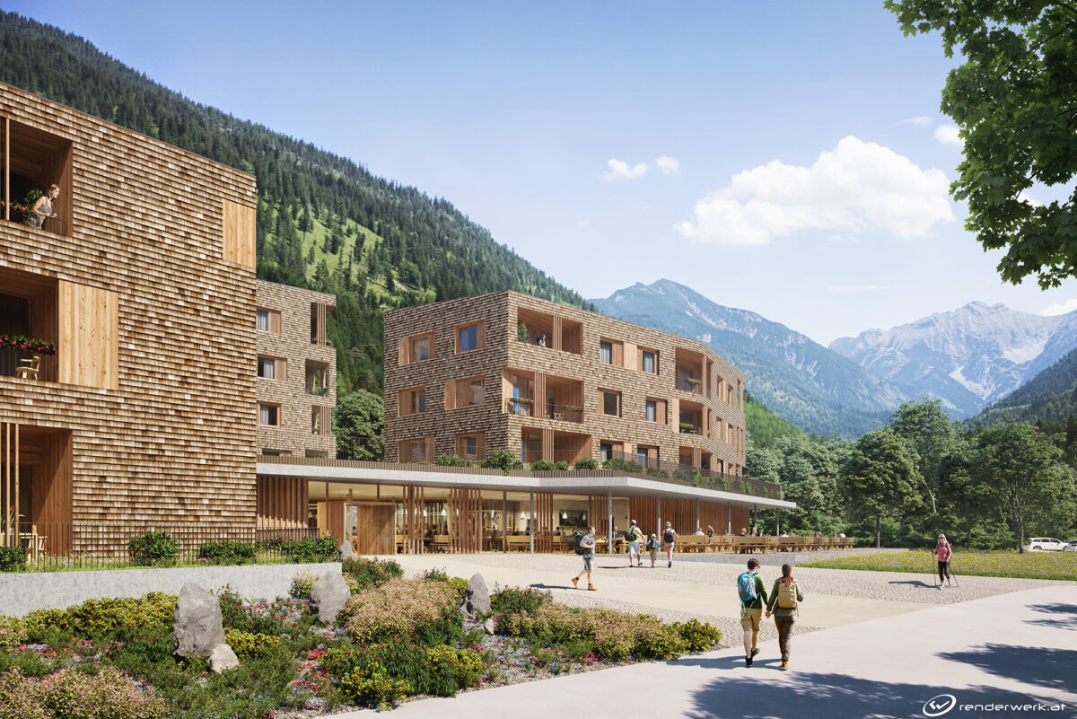 Während sich die Besucher talein- und auswärts bewegen, werden sie von der großzügig überdachten Terrasse der Brasserie, welche dem Baukörper vorgelagert ist, angesprochen. Diese exponierte Lage im Zusammenhang mit dem großartigen Blick über die Bergkulissen laden zum Verweilen und Erholen ein. Räumlich erweitert sich die Terrasse in einen geschützten, gut einsichtigen, gegliederten Naturraum, welcher als Kinderspielbereich benützt wird. Dieser Ort kann qualitätsvoll erlebt und belebt werden.