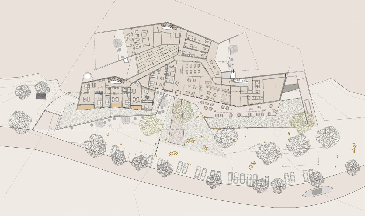 Aus den Gegebenheiten der Natur abgeleitet, lebt nun der Bach mit seiner Bewegung formal in der Architektur weiter. Die Fließbewegungen schaffen einen qualitätsvollen Außenraum. Durch die architektonische Ausformulierung dieses Raumes entstehen durchgrünte Bereiche mit Plätzen zum Verweilen, welche harmonisch die schöne ursprüngliche Kraft der Natur mit der Architektur verbindet.