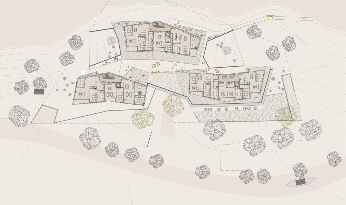 Drei Baukörper, welche auf einer Sockelzone positioniert sind, öffnen und strecken sich dem Sichtbezug talein- und auswärts folgend und erscheinen in ihrer Form als längliche Kristalle. Sie passen sich in ihrer Höhenentwicklung der natürlichen Topografie an und staffeln sich jeweils um ein Geschoss versetzt dem Gelände aufwärts.