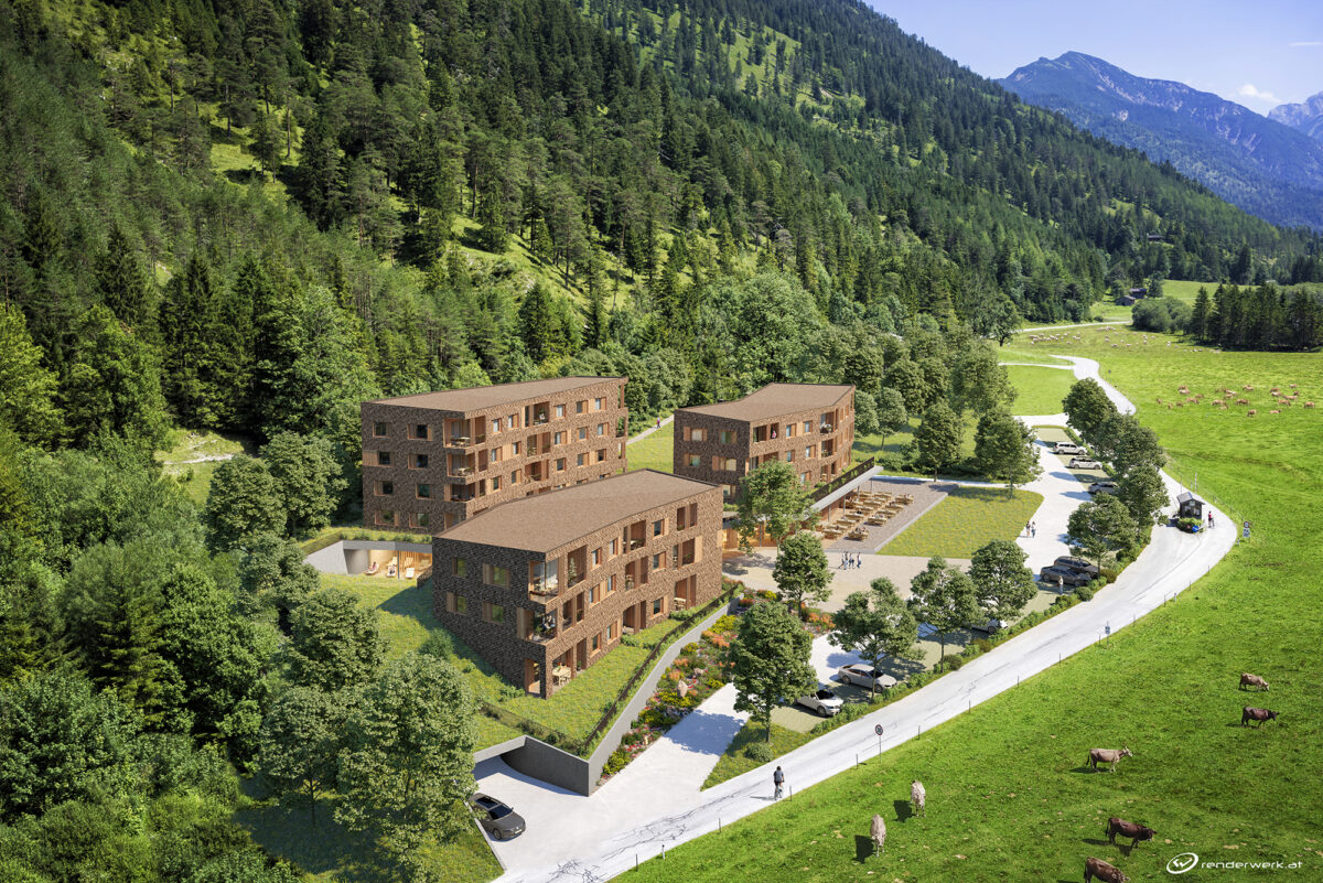 Aus dieser Metapher des Fließens und Modellierens abgeleitet entstand die Idee des Architektonischen Konzeptes für das Appartementhotel Hinterriss. Die mäandrierende Fließbewegung des Wasserverlaufes formte gedanklich die Holzstücke in ihr jetziges Erscheinungsbild.