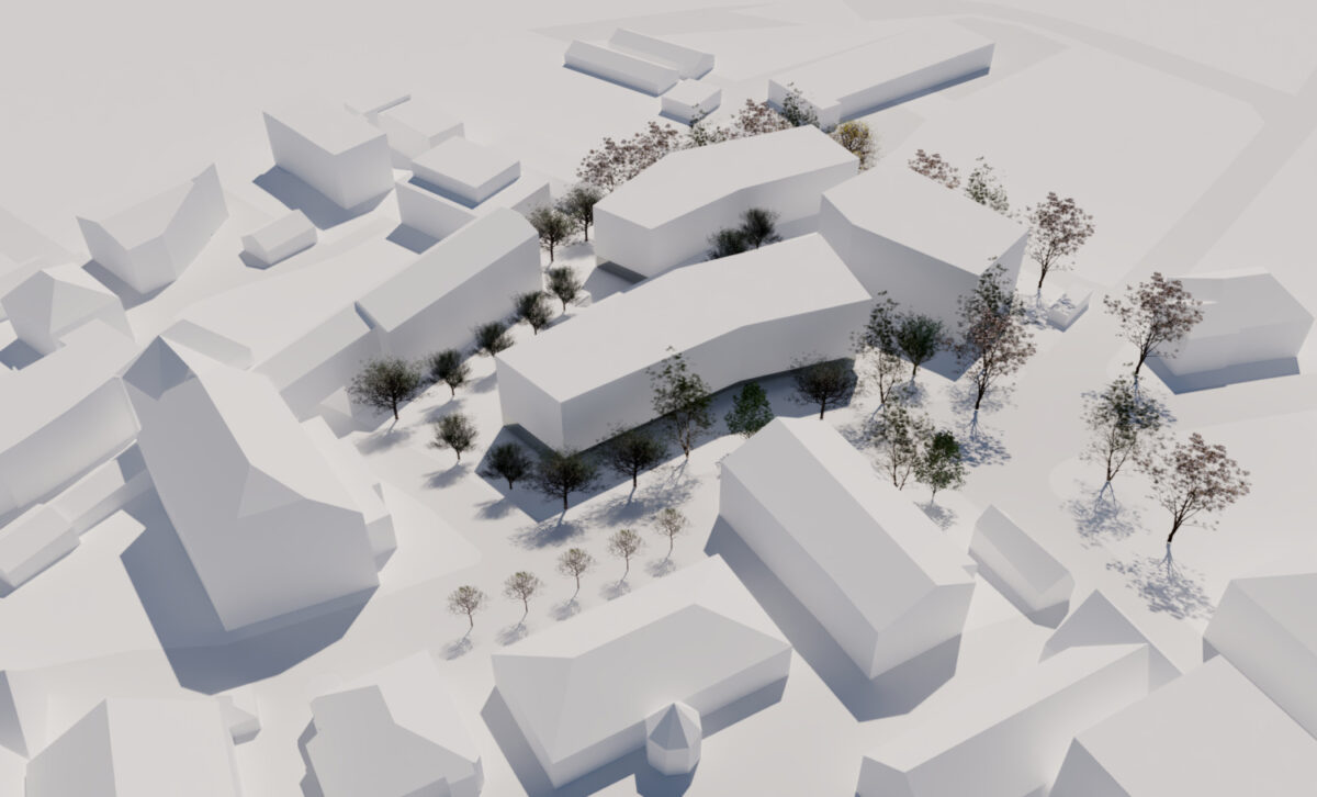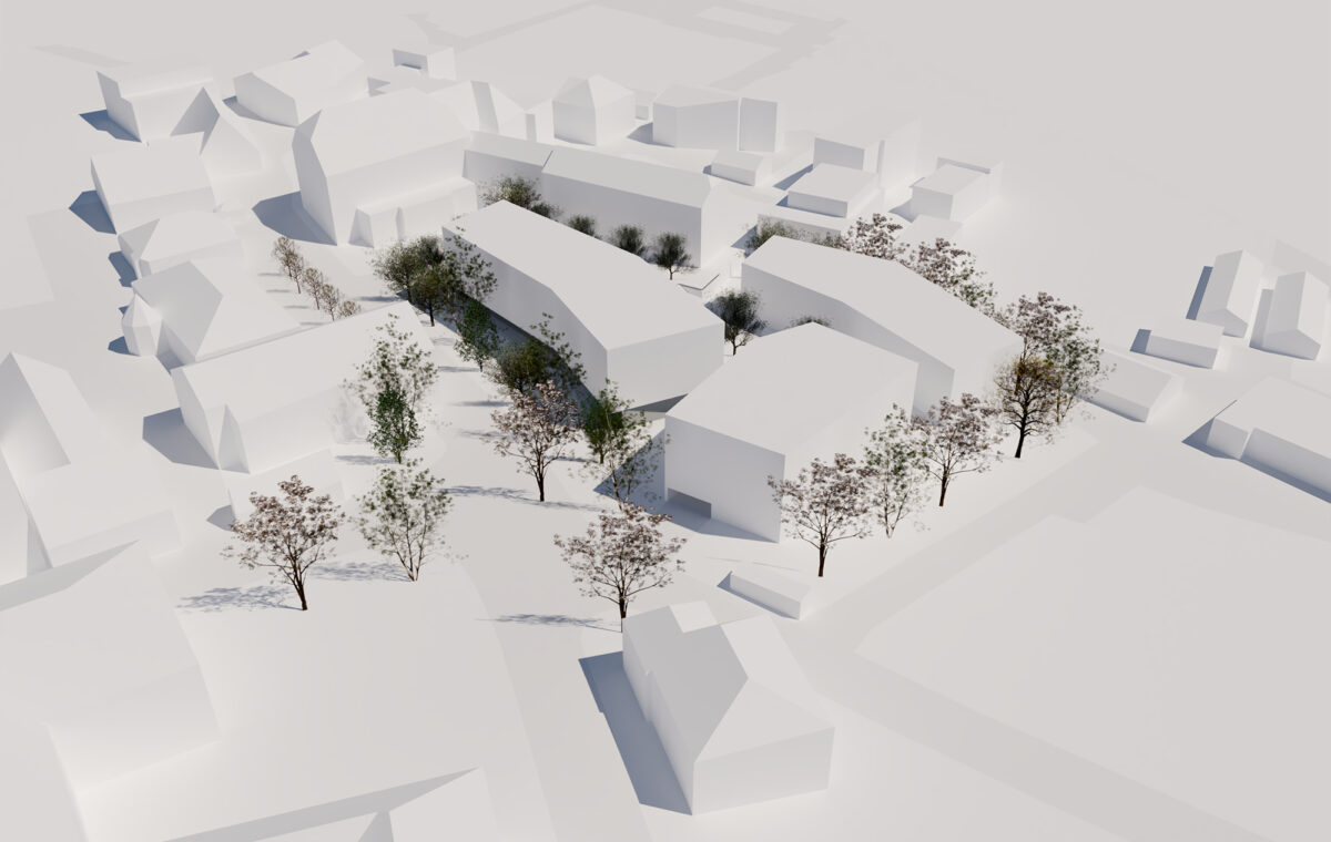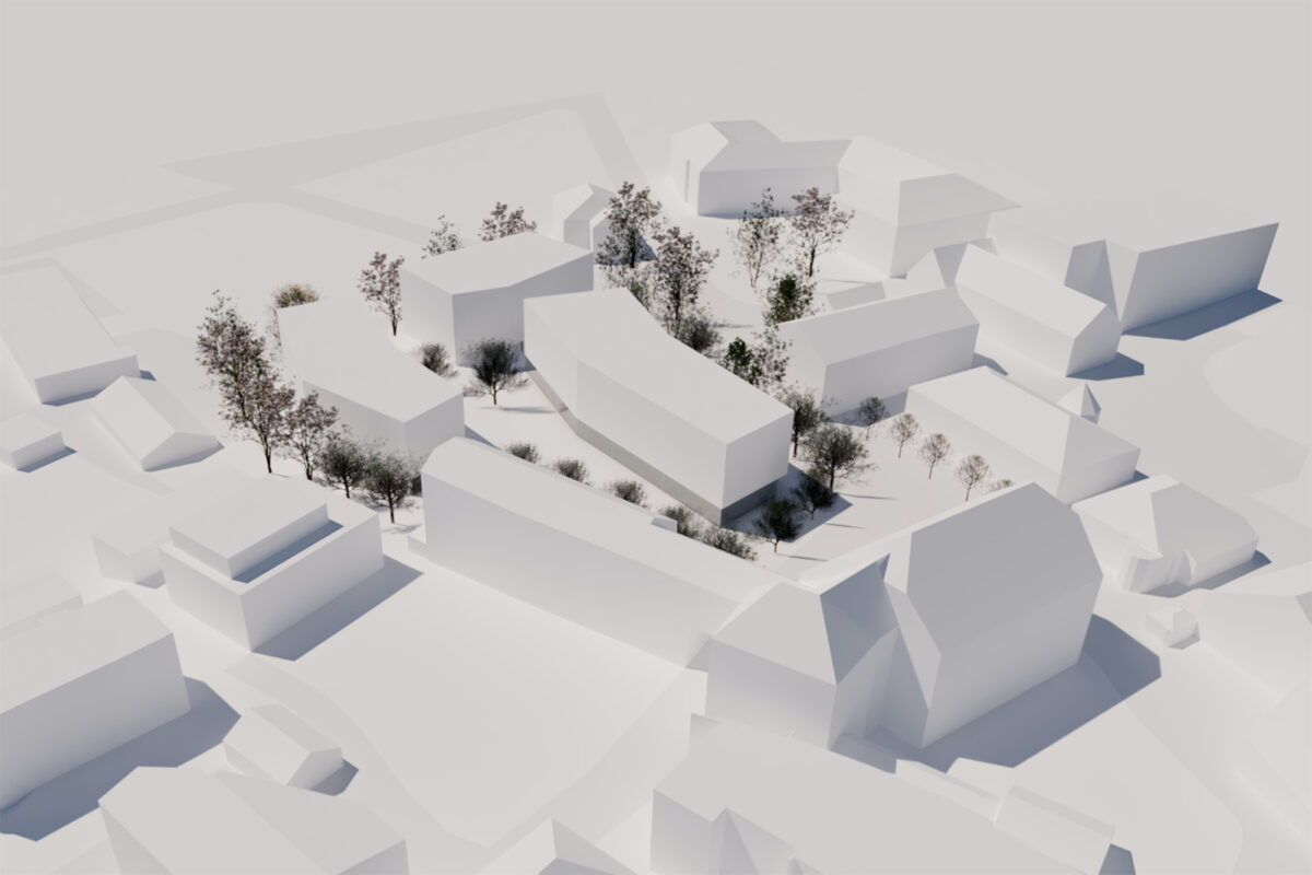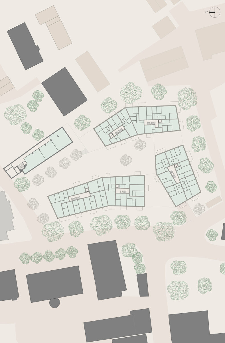 Der Entwurf zeigt drei kompakte neue Baukörper, welche in ihrer Setzung mit ihren verschiedenen Richtungen der Fassaden, Kanten und Höhen, Bezug zur Umgebung aufnehmen und sich dadurch selbstverständlich in die bestehende Umgebungsbebauung einfügen. Die Kompaktheit hat zudem den Vorteil, dass größtmögliche begrünte Außenraumflächen entstehen können. Das Projekt verleiht dem Ort eine neue, unverwechselbare Identität. Zudem wird dieser städtebaulich verstärkt und präzisiert. Das Projekt strebt ein ruhiges, zurückhaltendes Erscheinungsbild an, indem die wertvolle umgebende Bebauung präsent bleibt.