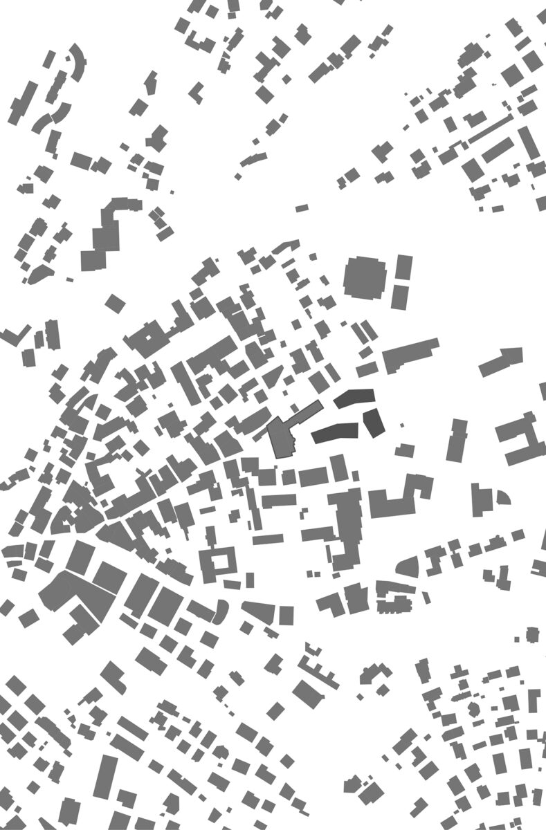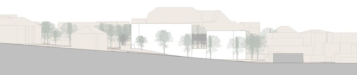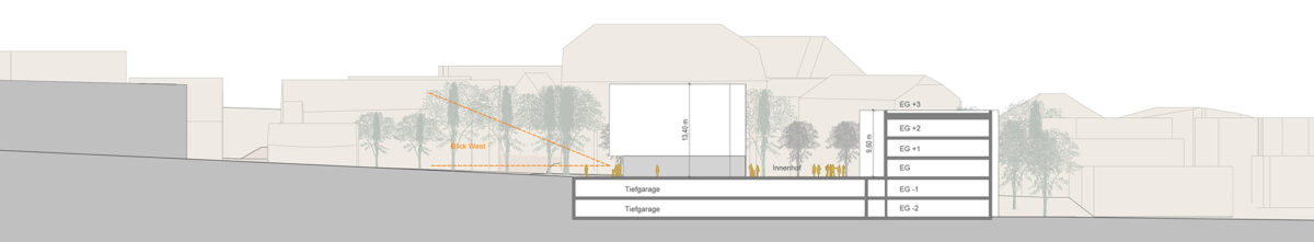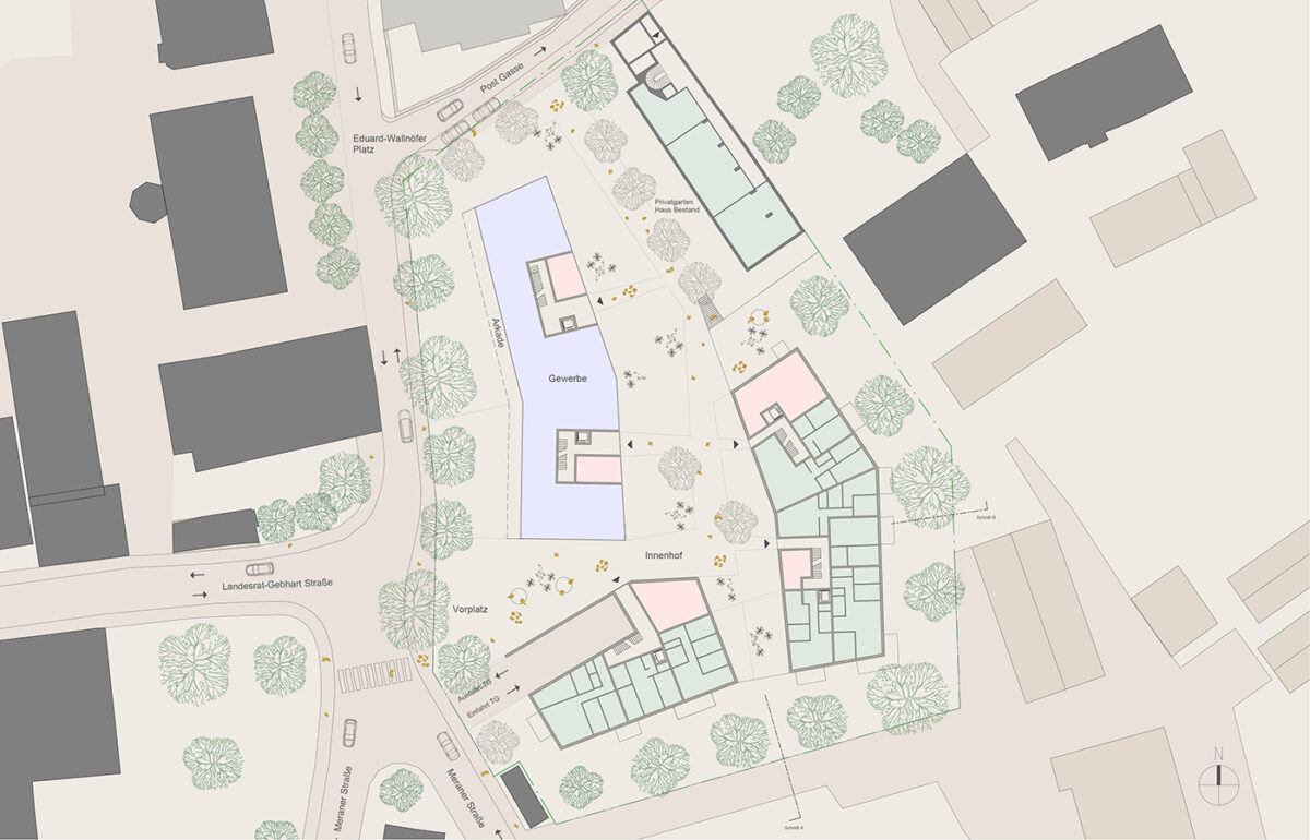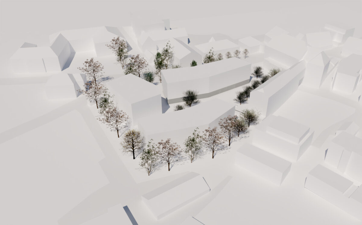 Der Entwurf zeigt drei kompakte neue Baukörper, welche in ihrer Setzung mit ihren verschiedenen Richtungen der Fassaden, Kanten und Höhen, Bezug zur Umgebung aufnehmen und sich dadurch selbstverständlich in die bestehende Umgebungsbebauung einfügen. Die Kompaktheit hat zudem den Vorteil, dass größtmögliche begrünte Außenraumflächen entstehen können. Das Projekt verleiht dem Ort eine neue, unverwechselbare Identität. Zudem wird dieser städtebaulich verstärkt und präzisiert. Das Projekt strebt ein ruhiges, zurückhaltendes Erscheinungsbild an, indem die wertvolle umgebende Bebauung präsent bleibt.