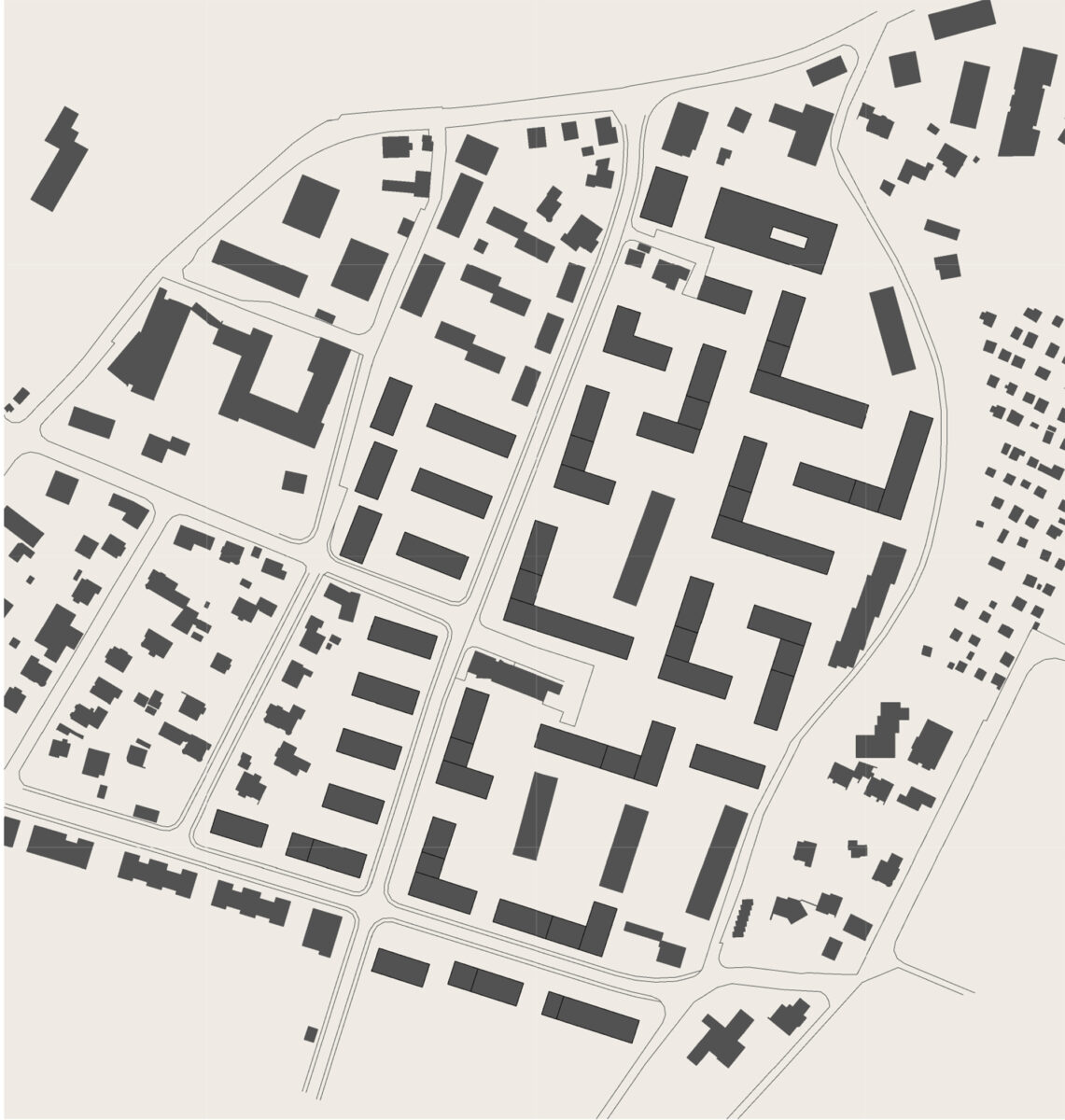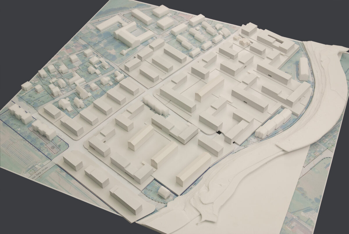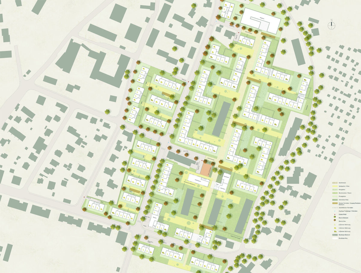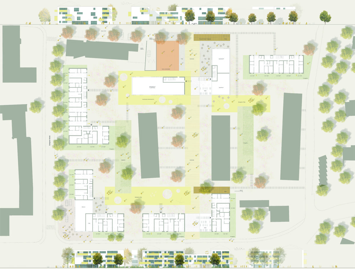 Abwechselnd werden abgewinkelte und teilweise zeilenförmige Baukörper in räumlicher Beziehung zueinander angeordnet, welche in ihrer Abfolge zusammenhängende Hofsituationen mit großzügiger Außenraumqualität ausbilden. Deren Abmessungen lehnen sich an die zu integrierenden Bestandsbauköper an und bilden mit ihnen eine städtebauliche Gesamteinheit aus.