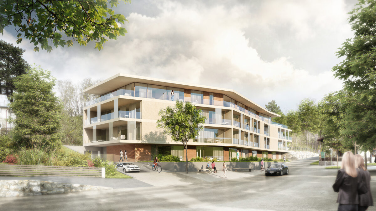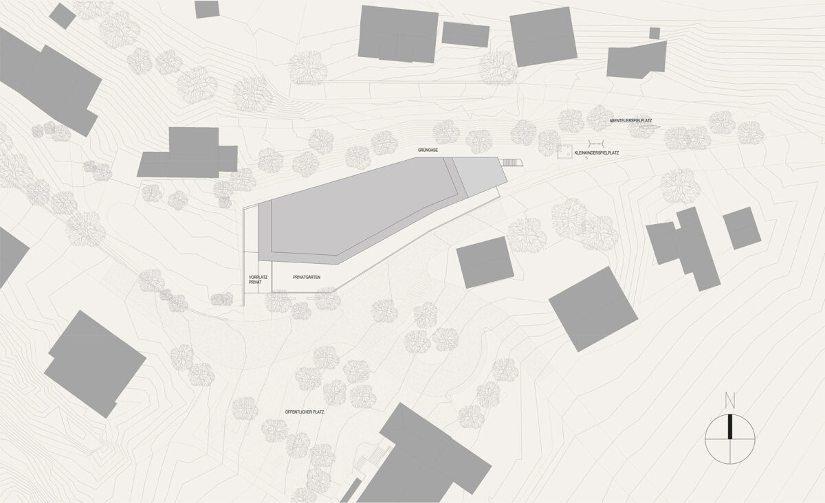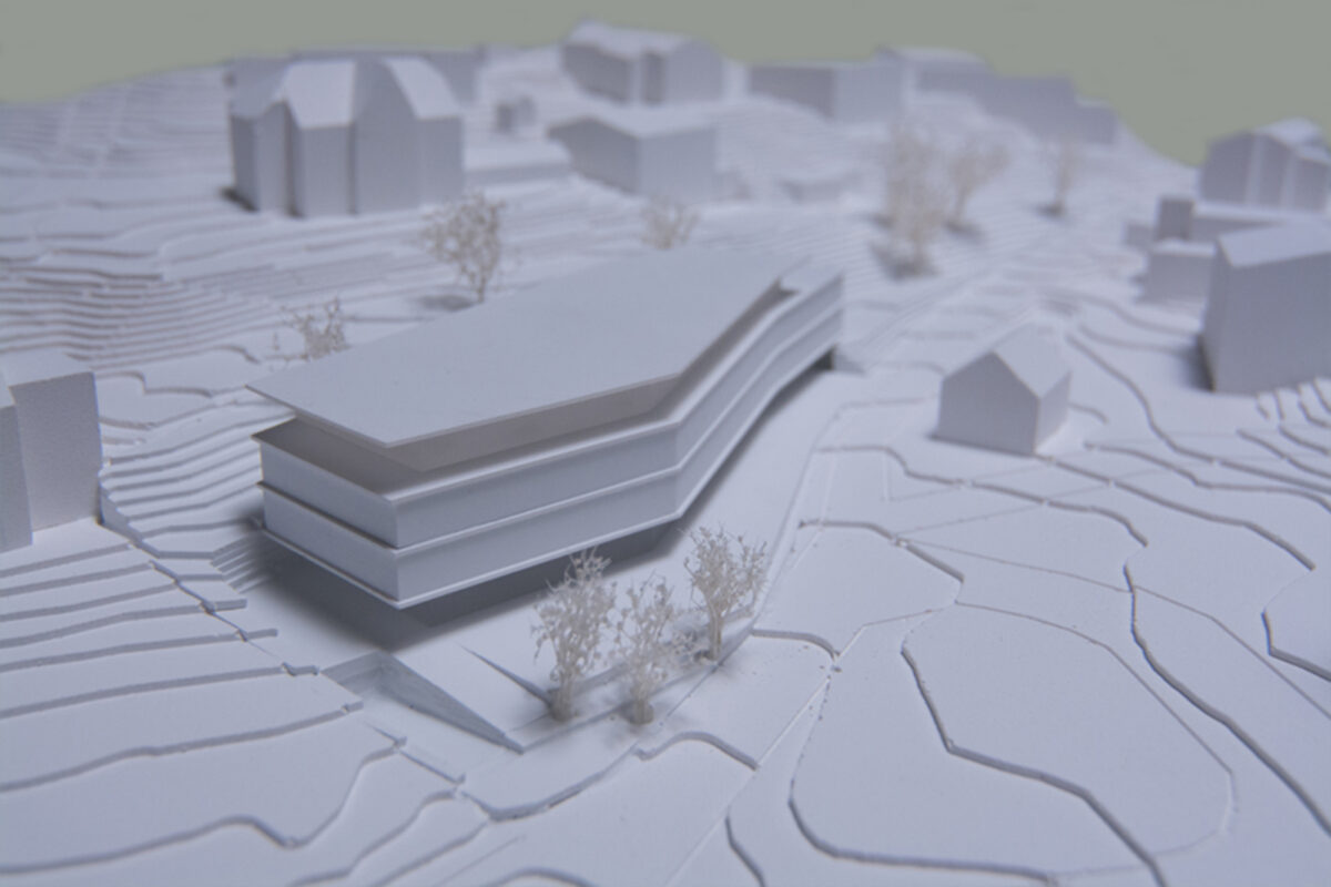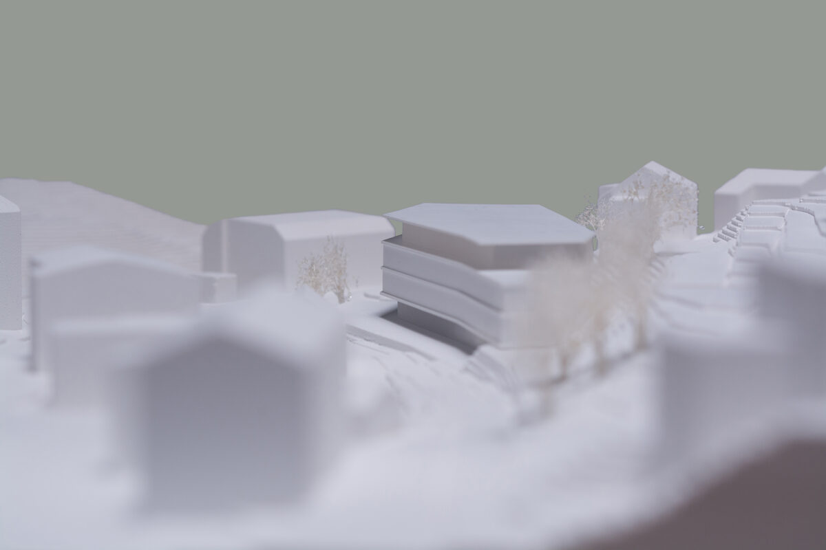 Die vorhandenen städtebaulichen Linien und Kanten, sowie die Topographie des Hanges beeinflussen und modellieren die Gebäudeform. Dem Straßenverlauf folgend schmiegt sich die Bebauung zurückhaltend, jedoch selbstbewusst in das Umfeld ein.