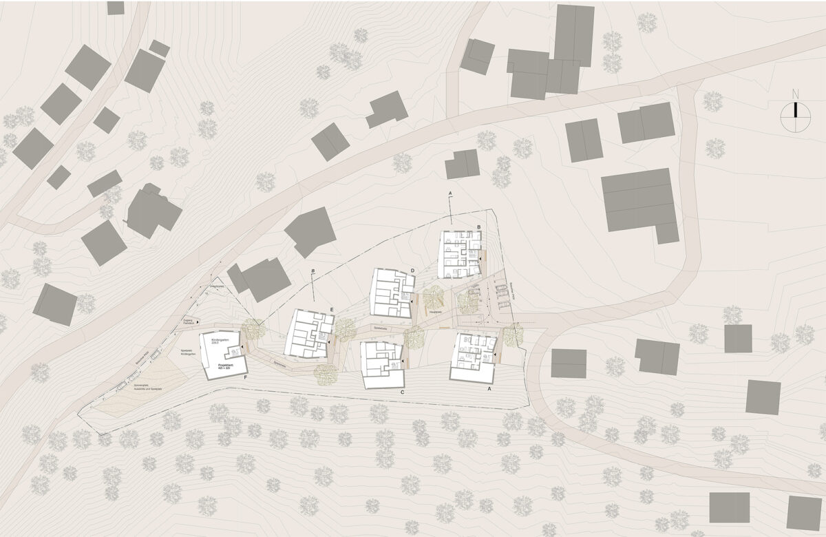 Grün- und Freiflächen sind qualitativ hochwertig gestaltet und bieten eine einladende Wohn- und Erhohlungsatmosphäre an. Baukörper, Wege, Platzflächen, Grünräume stehen in einem stimmigen Dialog zusammen und bilden im Zusammenspiel mit der umgebenden Natur eine neue, sich in die Örtlichkeit eingliedernde Bebauungsstruktur aus. Das bestehende Gelände ermöglicht eine sensible Höhenstaffelung der einzelnen Baukörper zueinander.