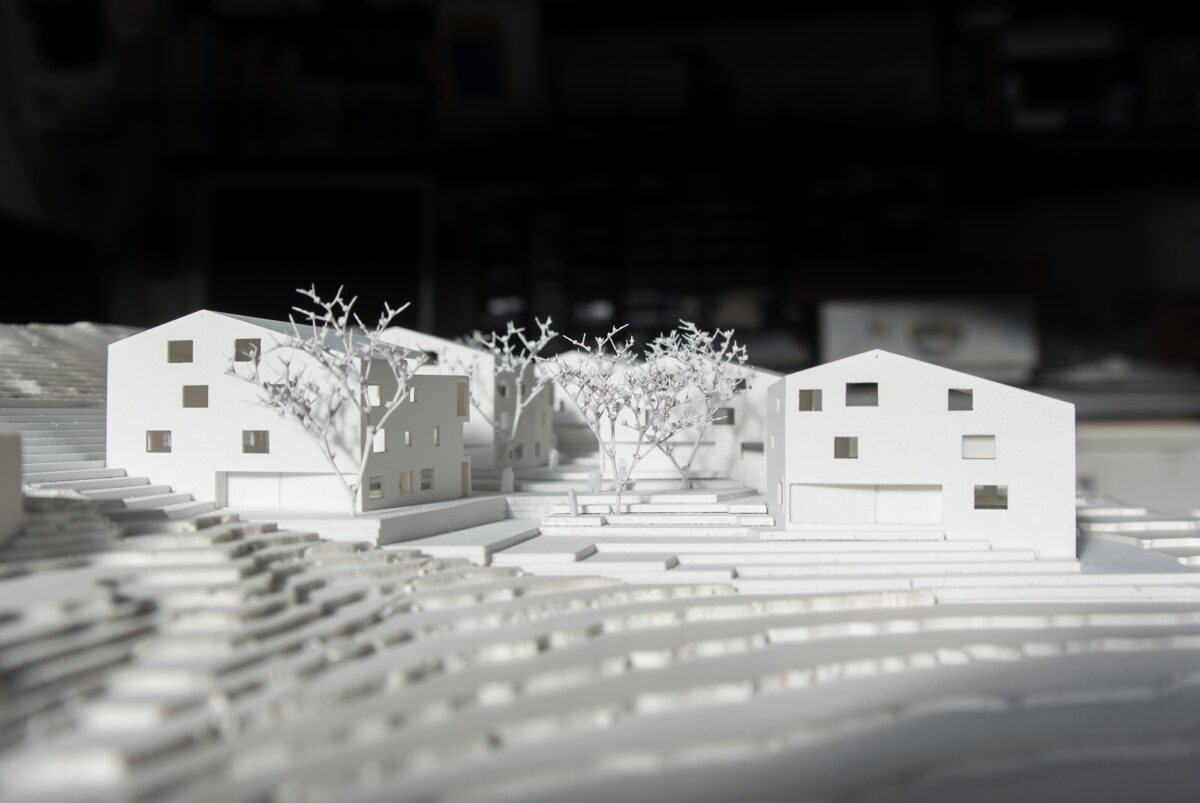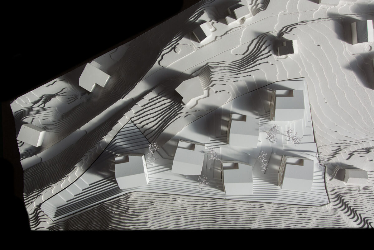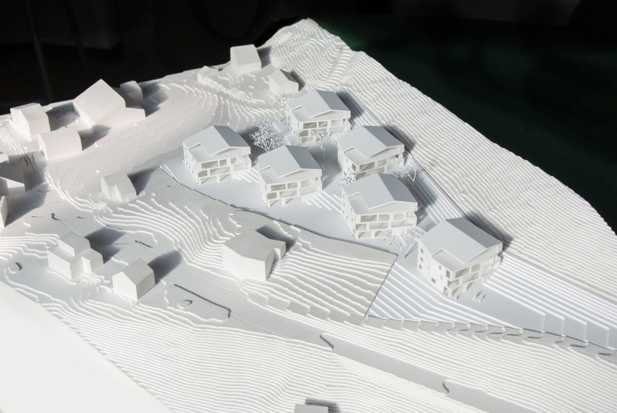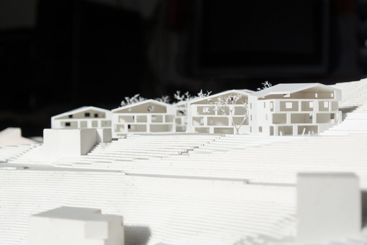 Auf dem Grundstück der Gemeinde Axams, Ortsteil Pafnitz, werden sechs in ihren Abmessungen selbstbewusst freistehende Baukörper in einer offenen, gestaffelten und durchgrünten Bebauungskomposition in das natürliche Gelände eingesetzt. Sie bilden im Zusammenhang mit den in den Grünraum gezeichneten Wegen und Plätzen ein feinkörniges Siedlungsensemble aus. Die Gliederung und Positionierung der einzelnen Baukörper richtet sich nach der Aussicht, Belichtung und dem natürlichen Verlauf des Geländes. Bewusst wurde eine kleinkörnige Bebauung gewählt, um eine großzügige Durchgrünung für die Bewohner anzubieten. Sensibel bemessene Zwischenräume und ein Wechsel von räumlicher Dichte mit weiten Blicken quer durch die präzise gesetzten Baukörper, verweben den ursprünglichen Ort mit großzügigen Aufenthalts- und Bewegungsräumen. Diese Abfolge von privaten, halböffentlichen und öffentlichen Raumsequenzen ermöglicht den Bewohnern sich zurückzuziehen oder am öffentlichen Leben teilzuhaben. Durch die besondere Anordnung der einzelnen Baukörper entsteht zudem eine spannende räumliche Konstitution, welche von Offenheit, Geschlossenheit und besonderen Blickbeziehungen geprägt ist.