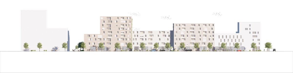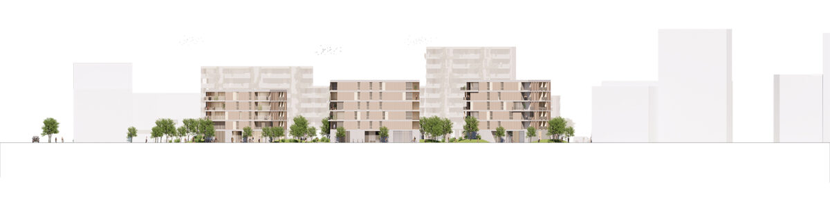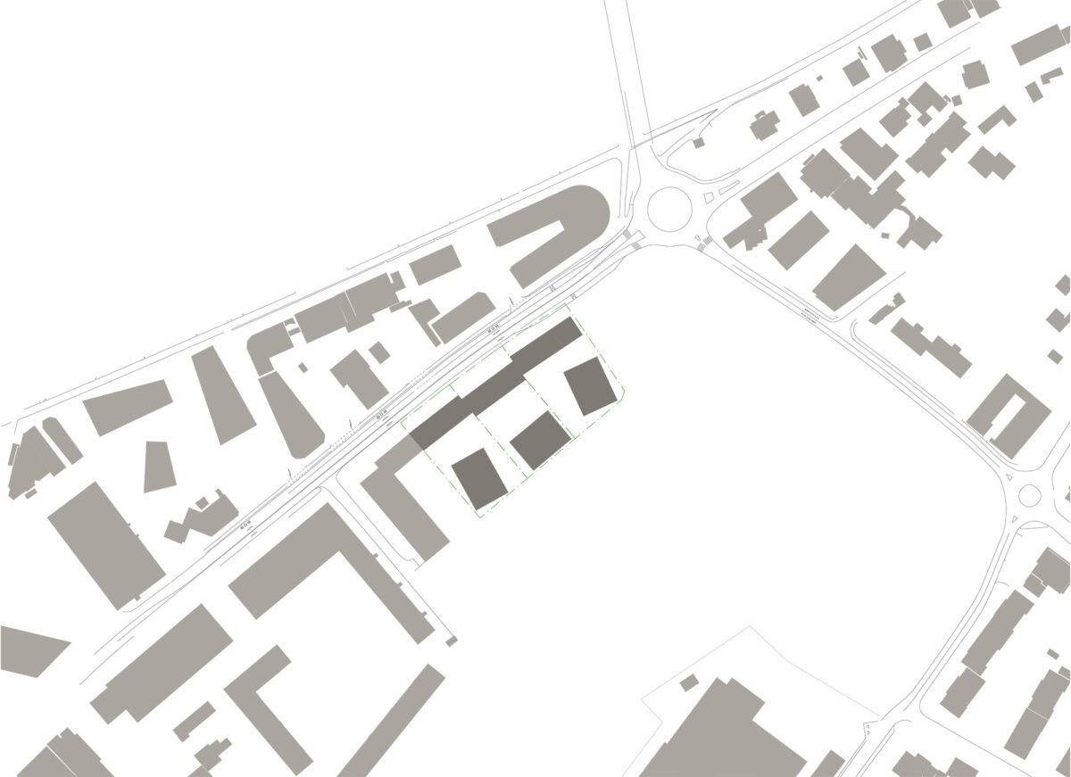 Durch die Positionierung der drei freistehenden Baukörper zur Zeilenbebauung werden differenzierte, großzügige Platzbildungen geschaffen. Die Baukörper formulieren über ihre Bezüge zueinander eine lebendige und spannende Raumabfolge. Enge und Weite wechseln sich ab und erzielen vielschichtige stadträumliche Qualitäten. Die Abmessungen entsprechen dem Leitprojekt und führen mit den zukünftigen Bauphasen zu einer städtebaulichen Gesamtheit.